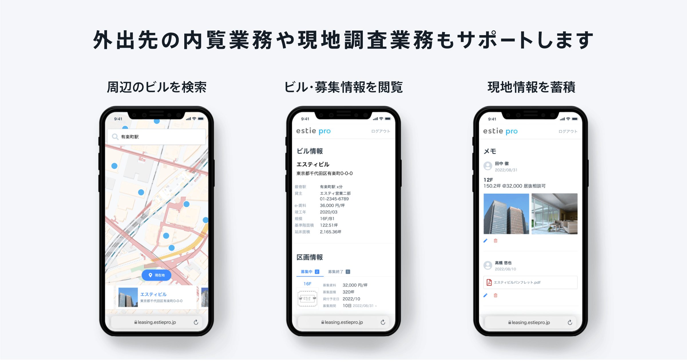「estie pro」では、開発要望の多かったスマートフォン版のリリースを行うことで、外出先でもスムーズに不動産マーケット情報へアクセスし、現地でしか得られないデータを物件ごとに蓄積することが可能となります。主な使用方法は以下の3点です。