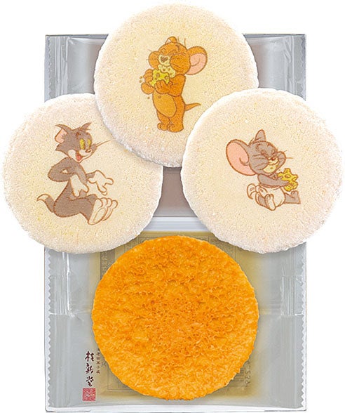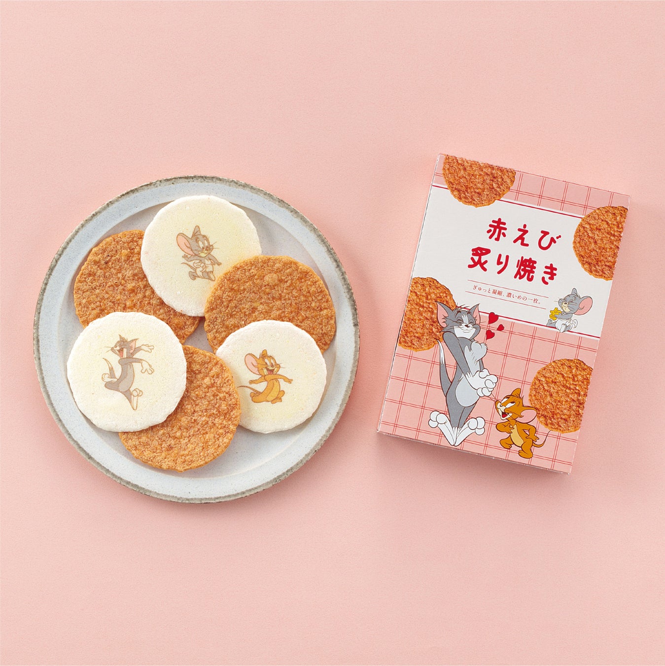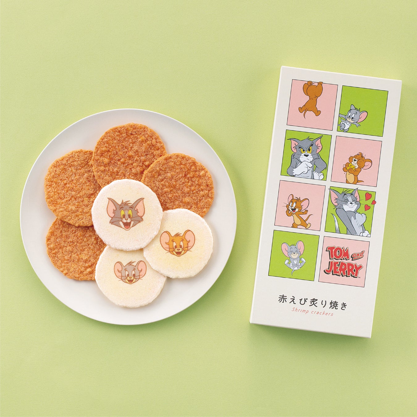ジェリーとタフィーの大好物・チーズをえびせんべいに押し当て焼き上げた「こんがりえびチーズ」と、トム、ジェリー、タフィーを描いたえびせんべいの詰め合わせです。