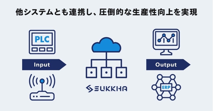 SUKKHAは、PLC、IoTセンサー、既存の基幹システムなどの他システムに取って替わるというより、「点」で使われているシステムを「線」でつなぎ、「面」にする役割を果たします。そのうえで、「設備のデータをどのように集め、扱うか」を定め、司る存在として工場の生産性向上に寄与します。