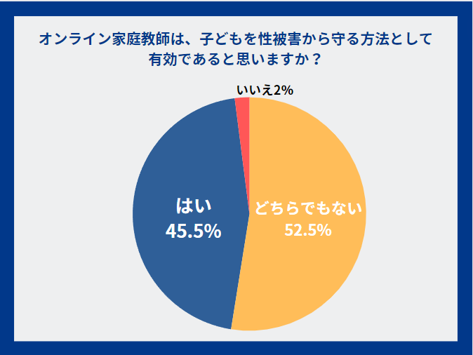 調査の結果、オンライン家庭教師を利用することで子どもの性被害リスクが減らせるという回答が45.5%となりました。具体的な安心感の理由としては、接触がないこと、運営側の確認体制、親が自宅で様子を確認できることなどが挙げられました。この結果を受けて、日本版DBSの認定を検討するとともに、オンライン授業によって子どもを性被害から守るためのさらなる改善を進めます。