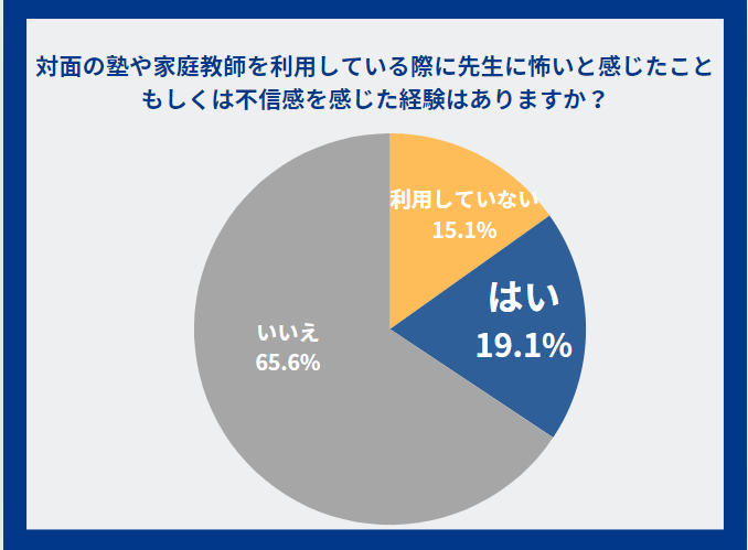 また、対面の塾や家庭教師を利用している中で、先生に怖いと感じたこと、もしくは不信感を感じた経験があるかという質問に対して19%のご家庭でそのような経験があったことが分かりました。