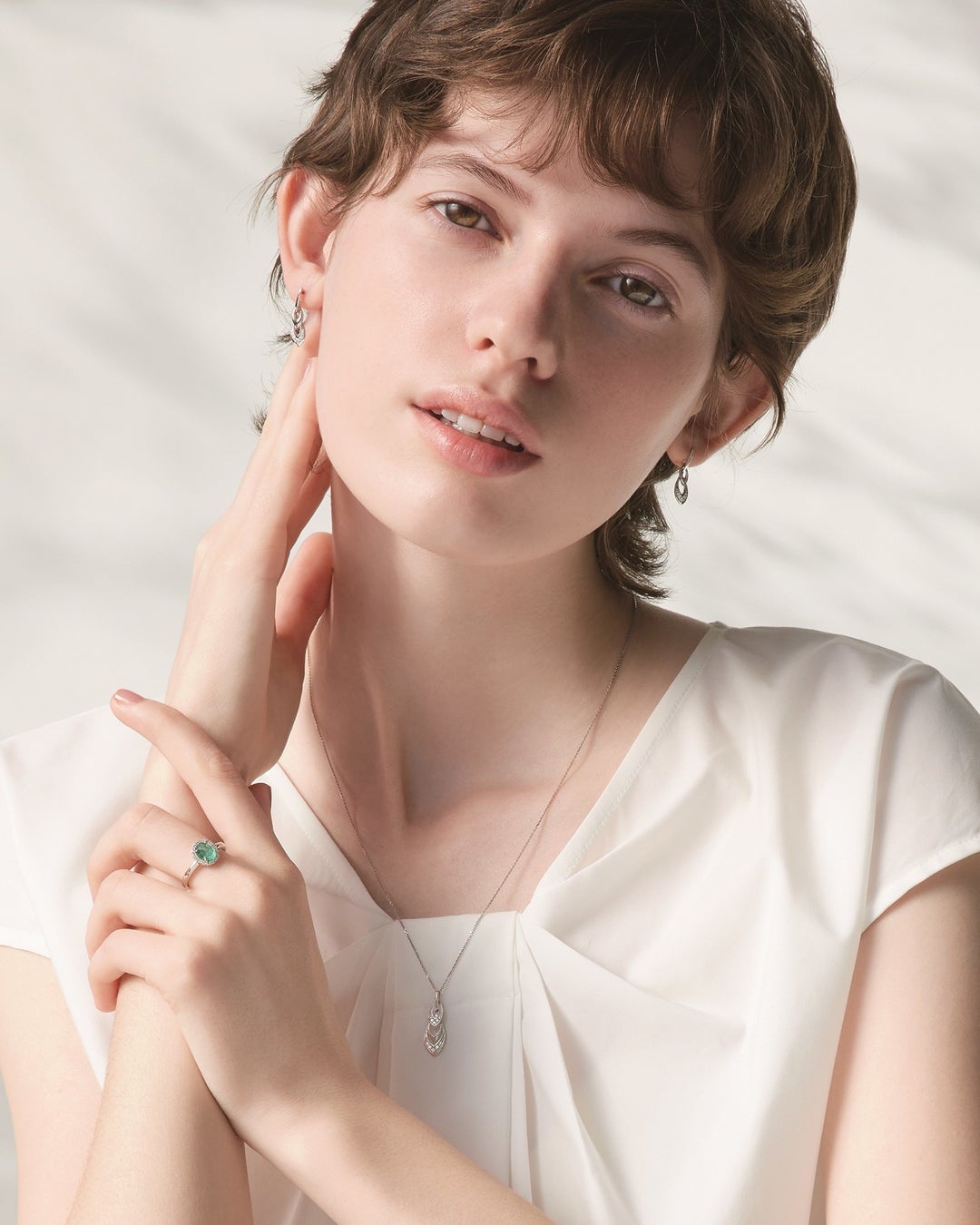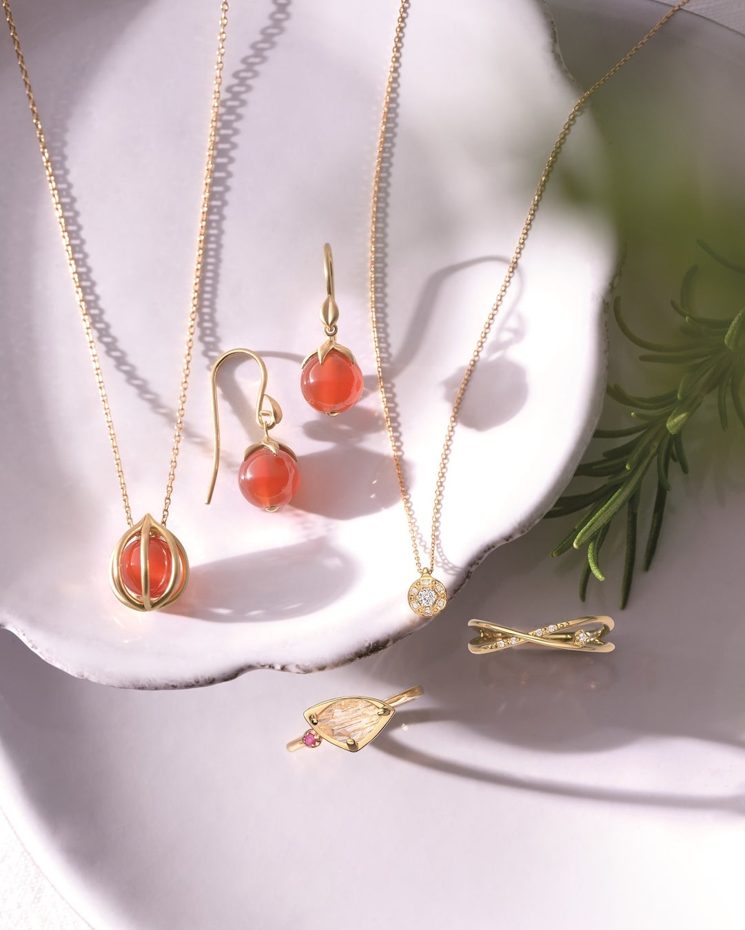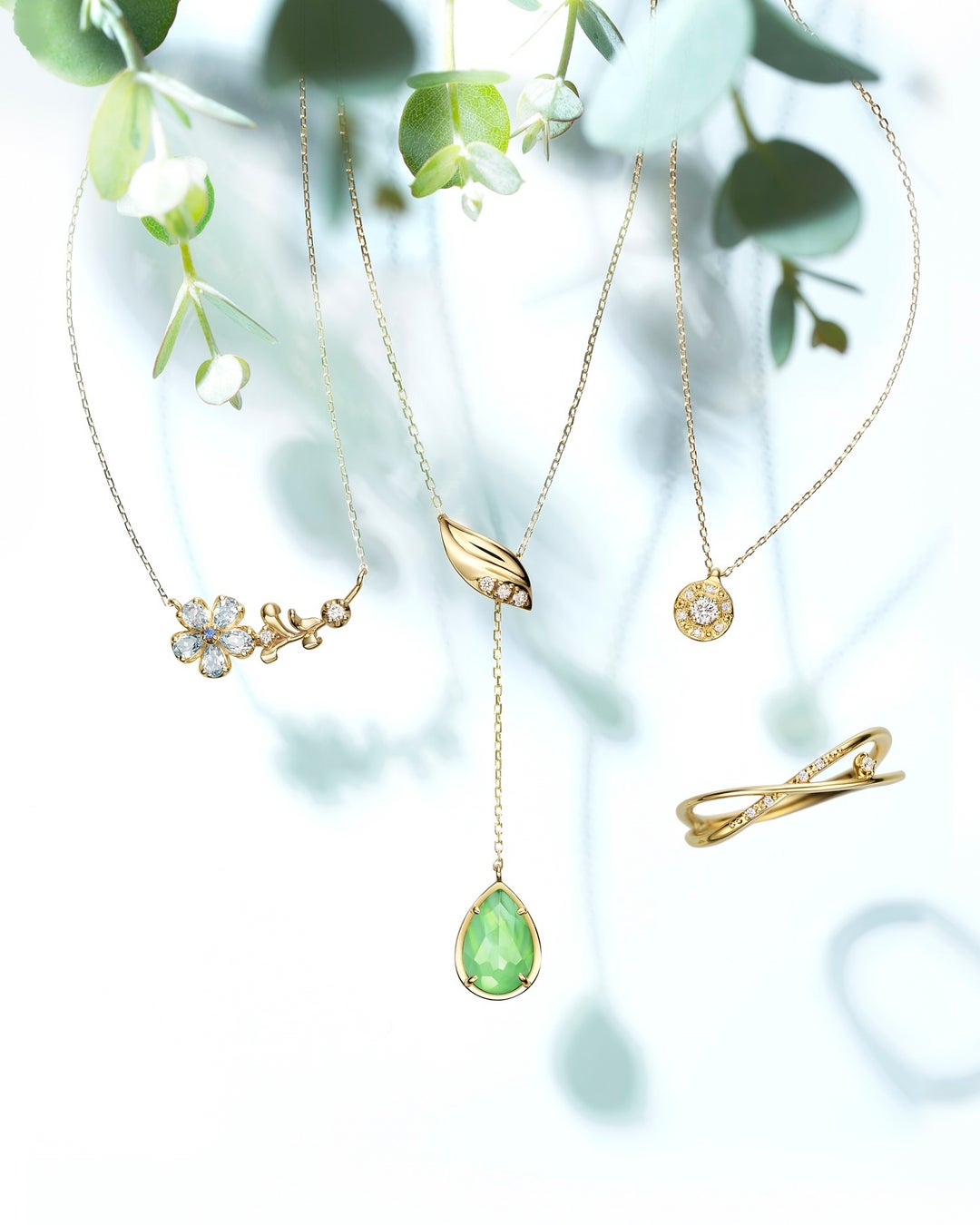 コリアンダーシードのフォルムをイメージした丸く愛らしいシルエットのダイヤモンドネックレスや、癒しを与えてくれると言われる緑色の植物を投影した2wayネックレス、透明感のある瑞々しいブルートパーズで表現したフラワーモチーフネックレス、そして植物の茎を思わせる2本の繊細でナチュラルなラインが美しいリングが限定アイテムとして登場します。
