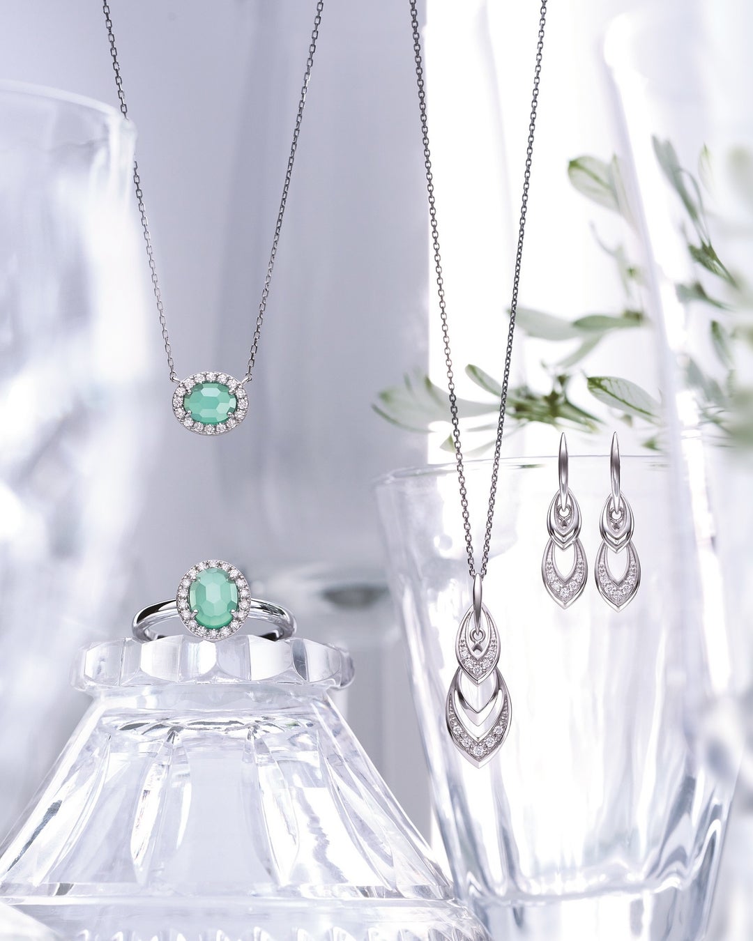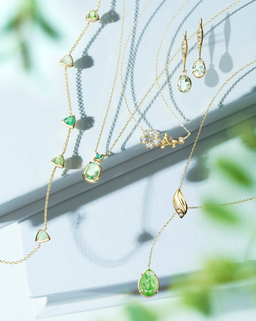瑞々しいグリーンのリングは、春を感じさせる木々の柔らかな新芽を表現しました。見る角度によって緑から青緑へ表情を変えるのは、グリーンカルセドニーの上にブルートパーズを重ねているから。そして右のネックレスとピアスは、柔らかな新緑の葉をイメージ。プラチナでデザインした大きさの異なる2枚の葉にダイヤモンドが木漏れ日のようにきらめきを添えます。どれも思わず深呼吸をしたくなる様な緑の香りを感じさせます。