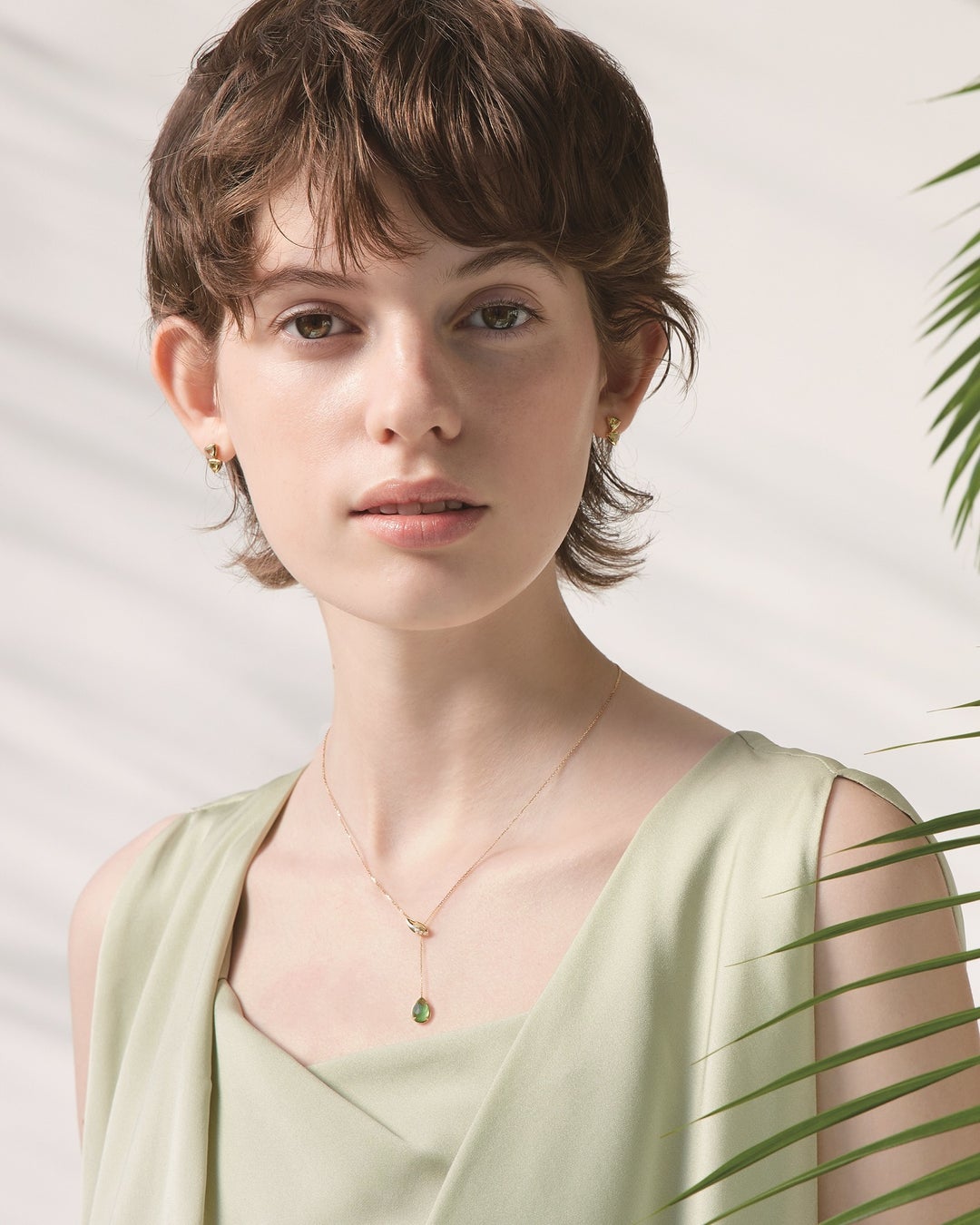 緑色の植物は部屋の雰囲気を変えるだけでなく、心と体の疲れを癒し、気持ちを落ち着かせると言われています。そんな観葉植物のイメージを、ゴールドのリーフモチーフと、2種類の「緑色」のカラーストーン、グリーンカルセドニーにグリーンクォーツを重ねたダブレットストーンを使用したネックレスに投影しました。