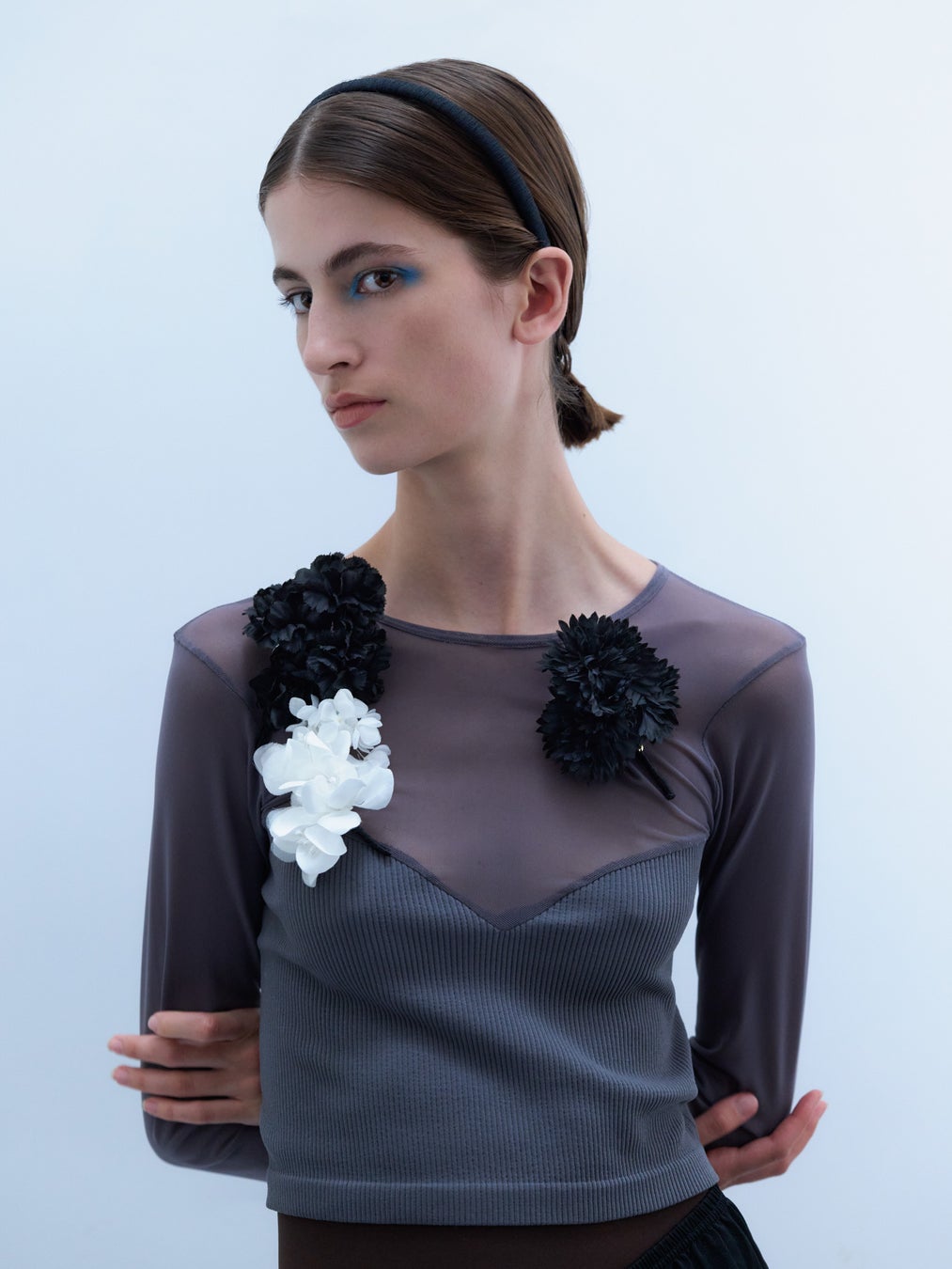 “高貴”という花言葉を持つ菊の花を、シアーな生地を立体的に重ねて表現。