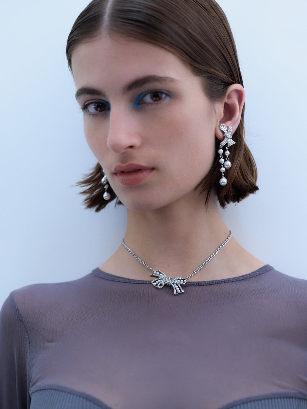 リボンモチーフを無骨な表情のチェーンと合わせて辛口に引き寄せたbow necklae。