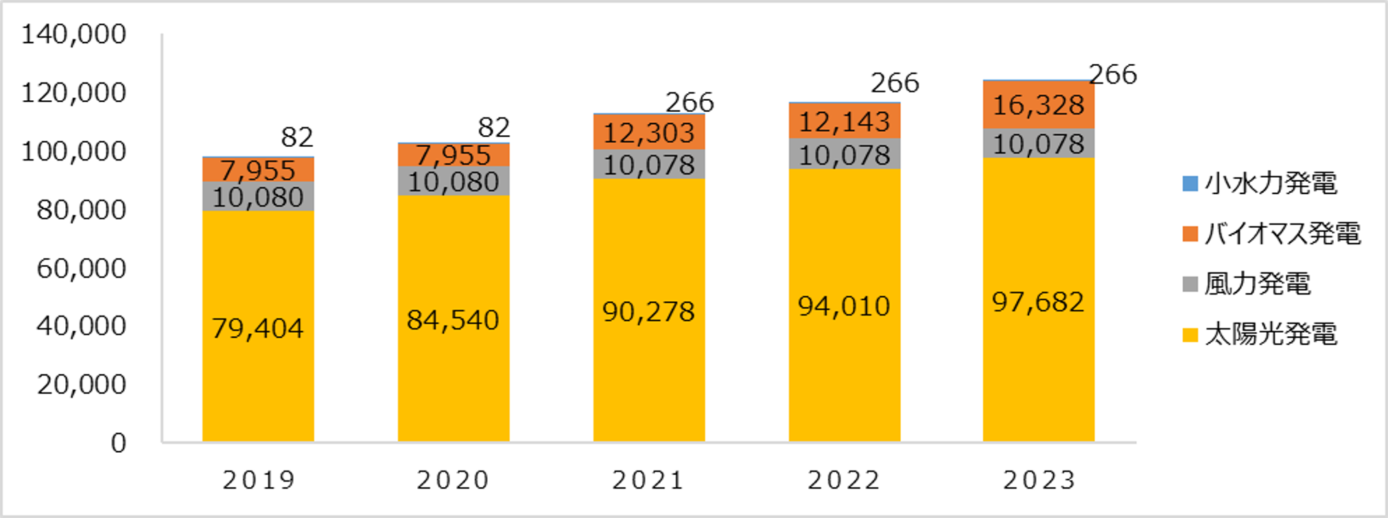 生協は2030年までに年間発電量4億kWh(設備容量200MW相当)の再生可能エネルギーを創出することを目標に掲げており、2023年時点で年間発電量約2.3億kWh(設備容量約124MW)まで開発できています。