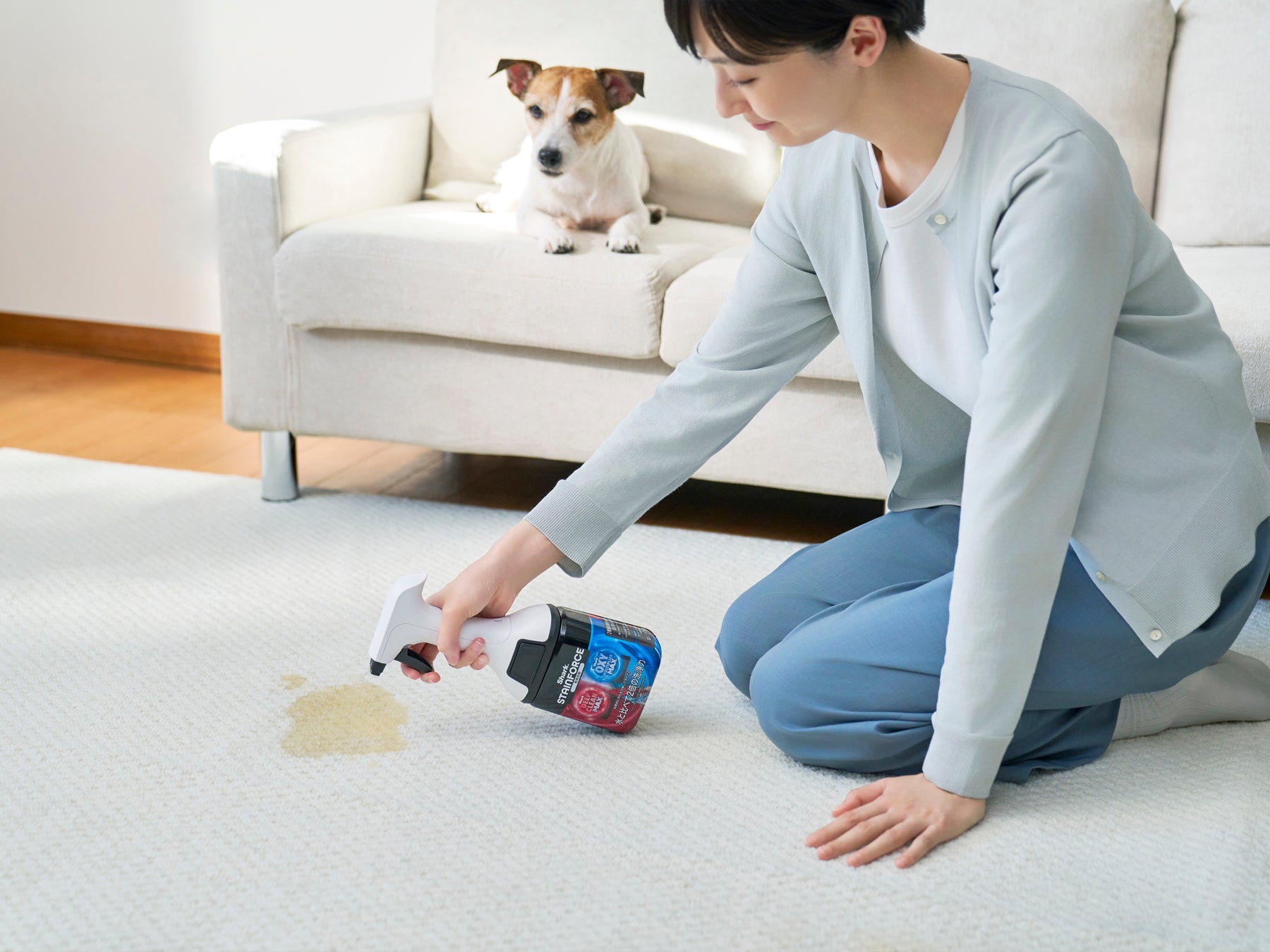 また、水と比べて洗浄力が2倍(※1)の専用洗剤付きで、高い汚れ落ちと消臭効果を発揮します。ペットがいる家庭でも安心して使用でき(※2)、カーペットについた足跡や粗相などのにおいも除去します。