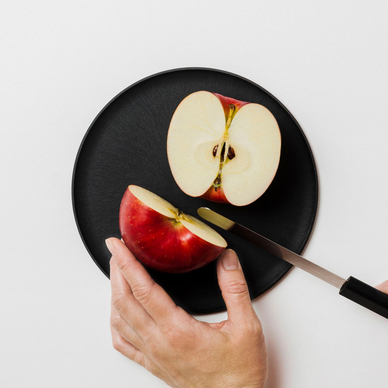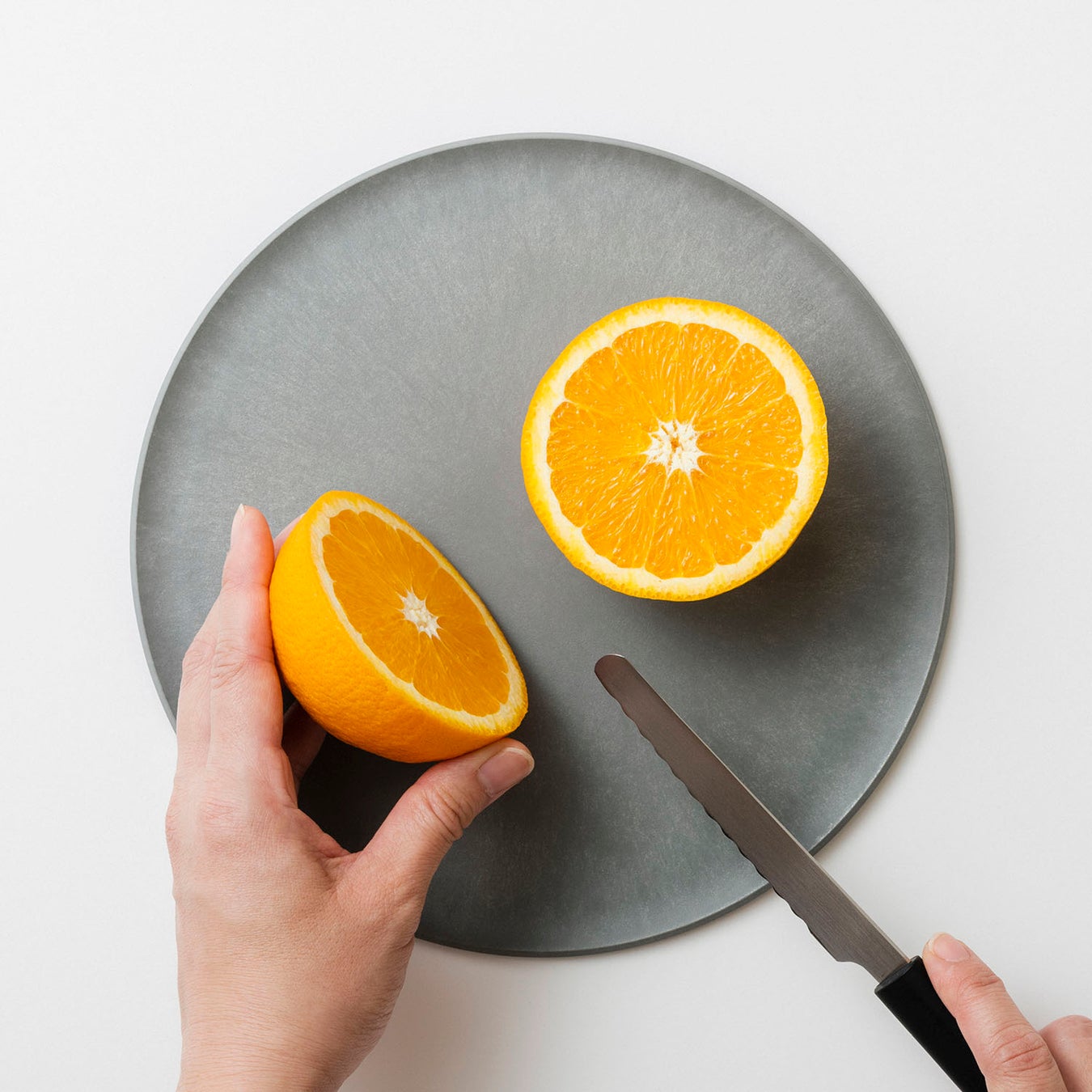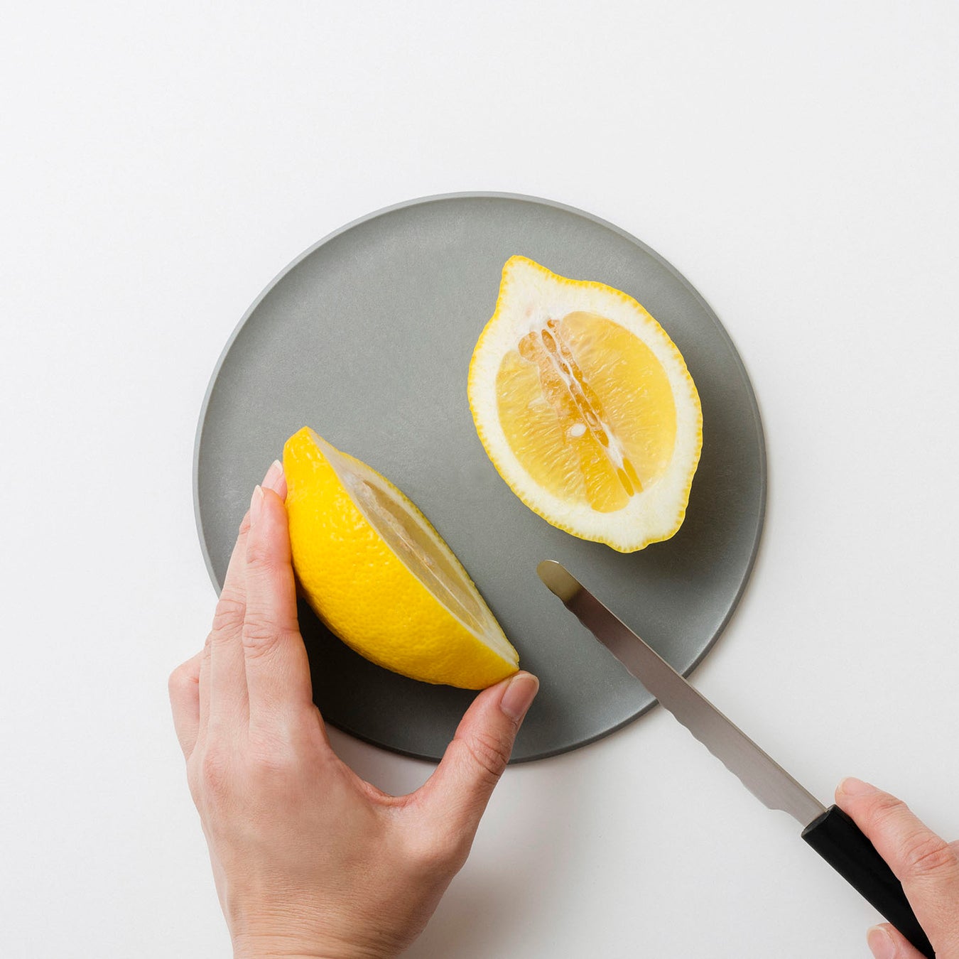 2021年に小皿サイズが発売開始されたCHOPLATEは、フルーツやパンやおつまみなどを、ちょっと切りたい。テーブルの上の料理を、子どもが食べやすいサイズに切り分けたい。そんなシチュエーションに最適な、まな板になるお皿です。これまでに小皿(直径174mm)、中皿(220mm)、大皿(260mm)、そしてミニナイフとボウルが発売され、口コミだけでシリーズ累計22万個を突破しています。