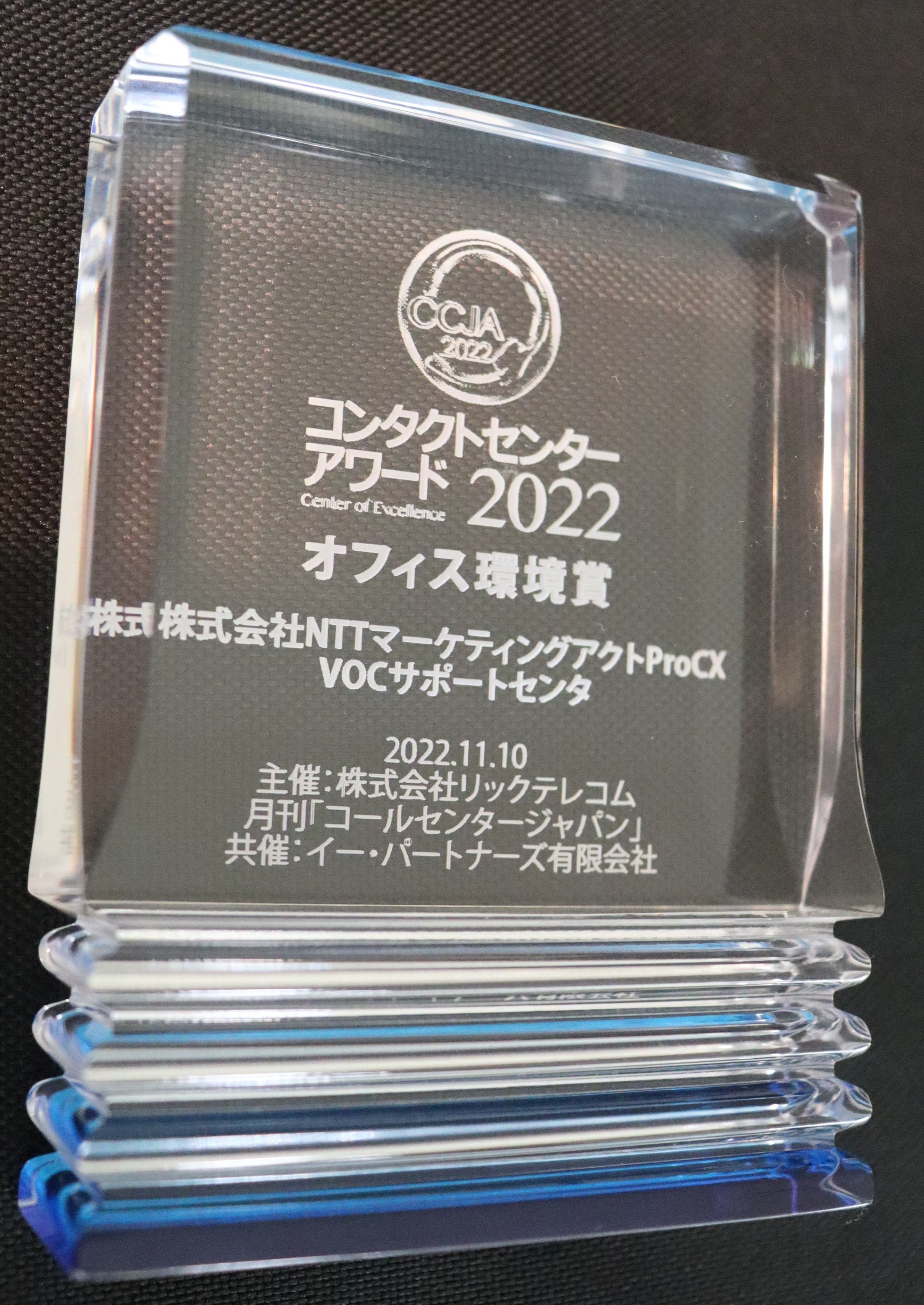 NTTマーケティングアクトProCXが運営するVOCサポートセンタ「LINKSPARK金沢」は、顧客体験(CX)向上に向けたお客さまの声(VOC)分析・コンサルティング※3を提供しており、この度、当該共創スペースがコンタクトセンター・アワード2022 オフィス環境表彰部門「オフィス環境賞」の受賞に至りました。今後もNTTマーケティングアクトProCXは、働く人の多様なニーズに応える職場環境の整備による従業員体験(EX)の向上を通して高い付加価値を創出し、クライアント企業様のCX向上をサポートしていきます。
