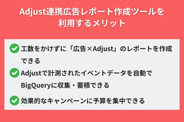このツールで出力できるレポートは、「キャンペーンレベルでのAdjust連携広告レポート」です。