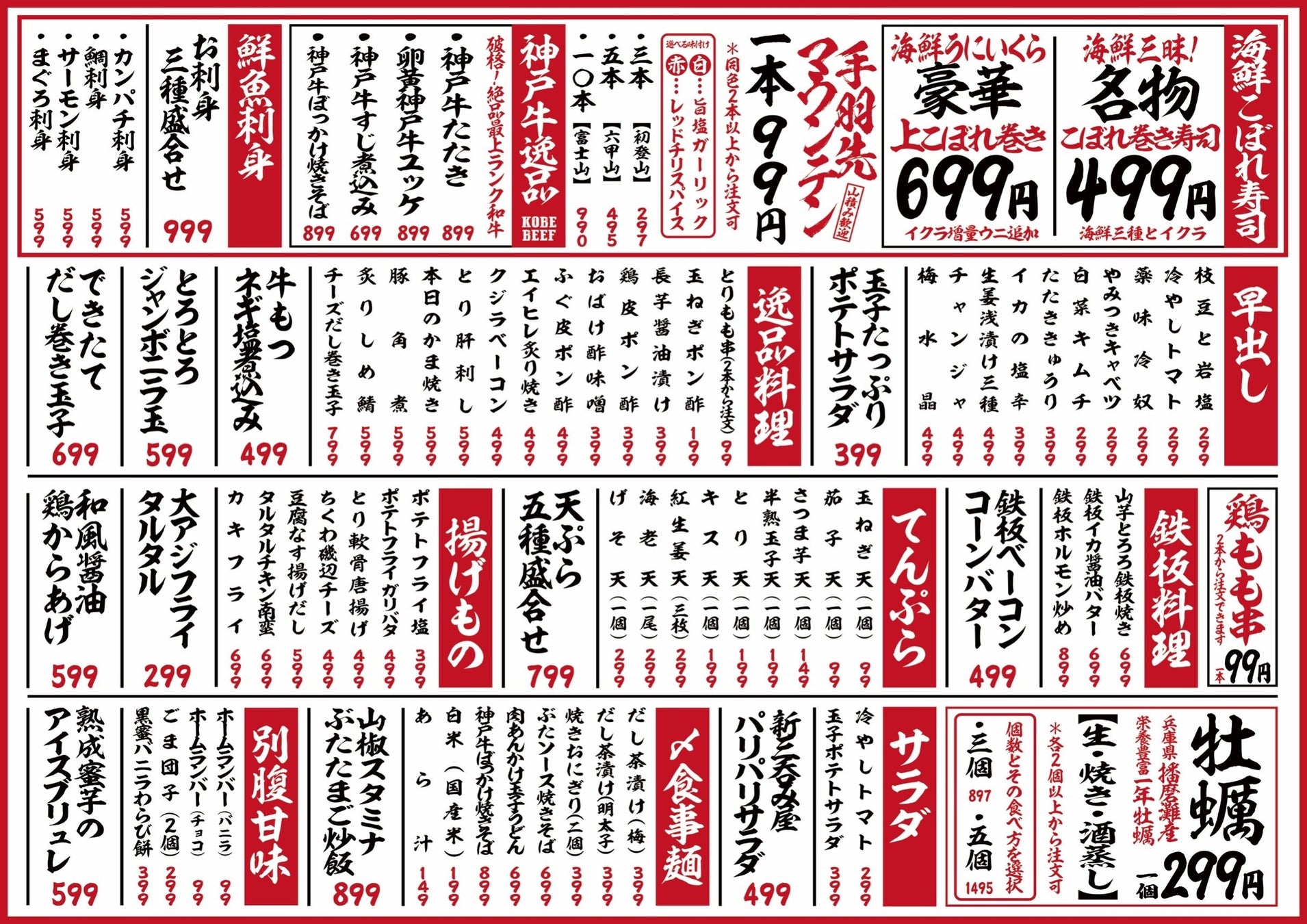 お得で幅広いジャンルのメニューをご用意しました。三呑み屋本店では提供していない播磨灘産の牡蠣、日本三大和牛である神戸牛を使ったメニュー、さらにオリジナルスパイスで作り上げた1本99円(税込109円)の手羽先は特におすすめです。