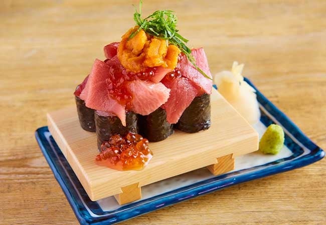 細巻きの上にいくら・かんぱち・サーモンなど、その日仕入れた新鮮な魚をこぼれる程たっぷり乗せた、見た目も迫力満点なイチオシメニュー!※写真は(上)