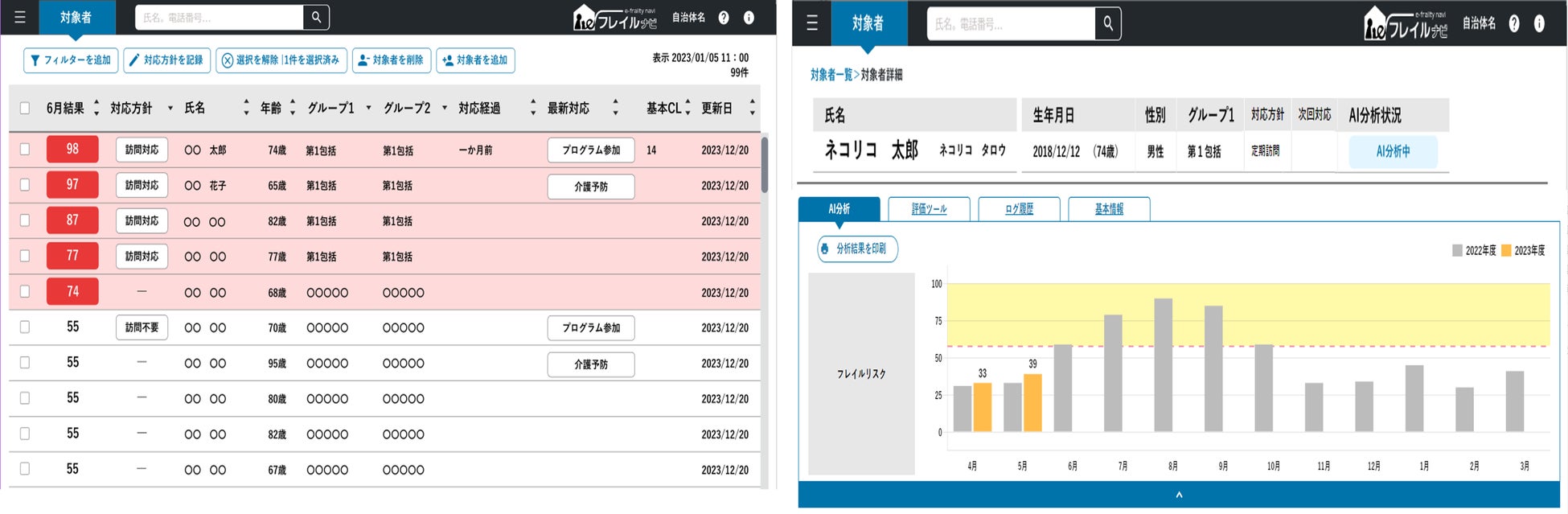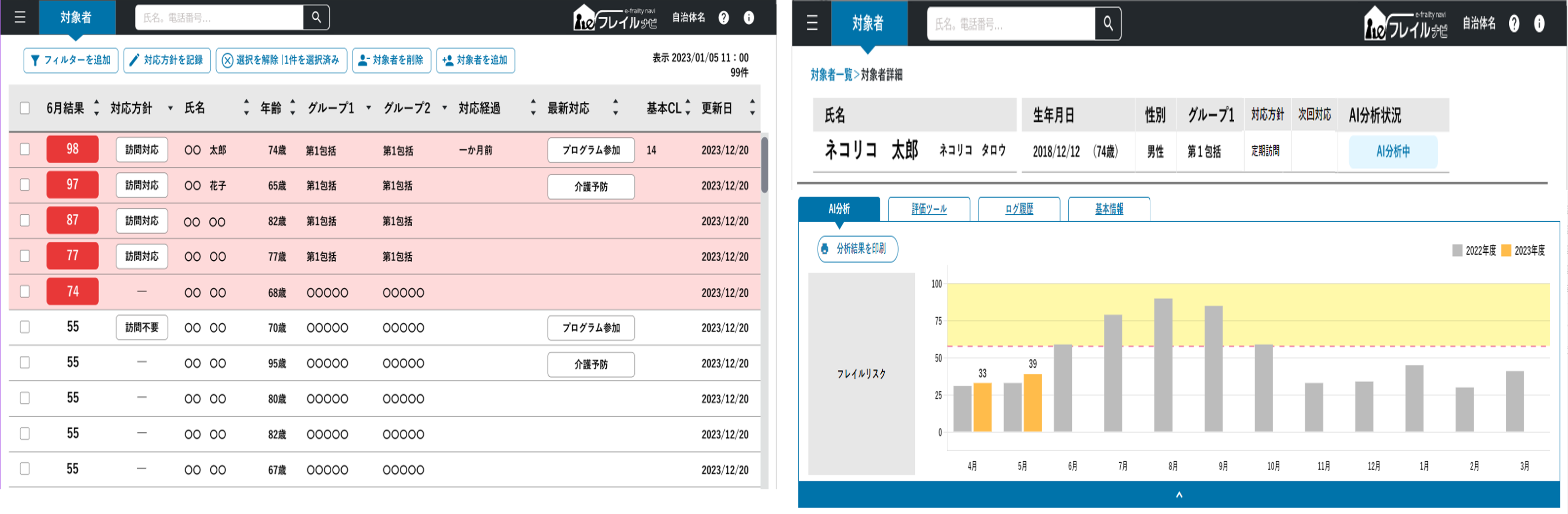 フレイルリスクは毎月自動更新され、自治体の関係職員に共有されます。フレイルの早期発見、個別的支援の効率化を支援します。