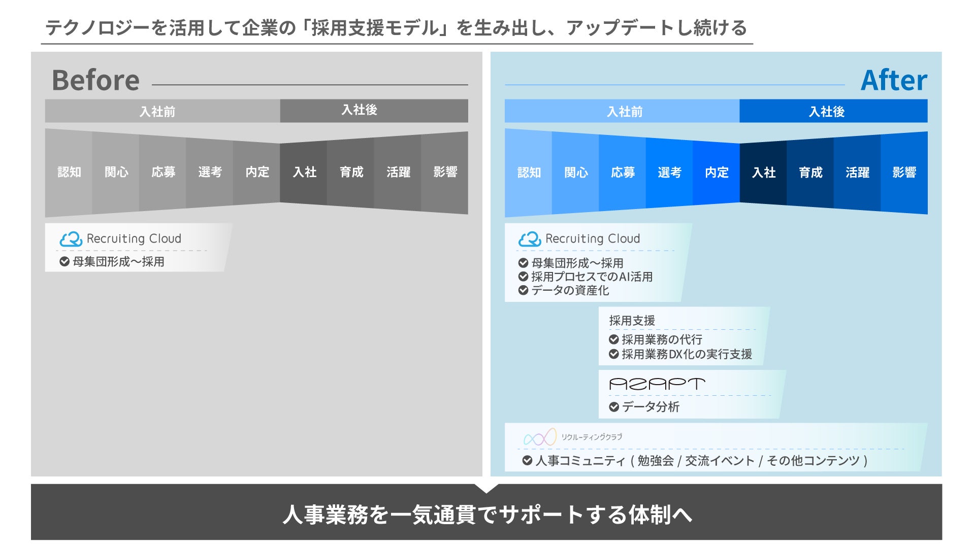 2018年に創業したHR Forceは、「Go HR Transformation!ー テクノロジーで”働く”を変えていく ー」というVisionのもと、採用マーケティングツール「Recruiting Cloud」を通じて、導入社数7,500社超、総応募数約50万件以上を獲得し、企業の採用課題の解決を支援してまいりました。創業から今日に至るまで、企業のHR部門に求められる役割は日に日に増しており、採用から定着まで、あらゆる人事業務を一気通貫で対応する重要性が高まっております。