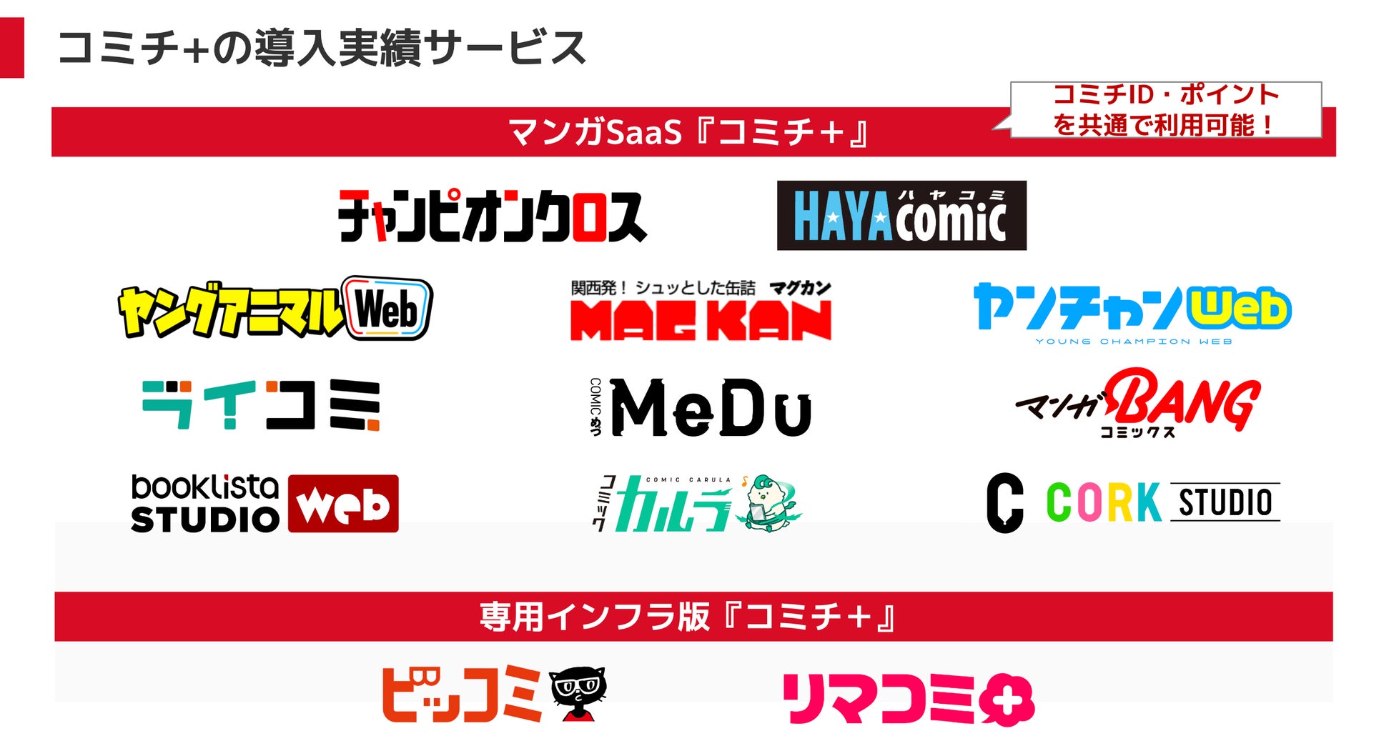また、「コミチ+」導入で先行する「チャンピオンクロス(秋田書店)」「ヤングアニマルWeb(白泉社)」「ライコミ(マイクロマガジン社)」など12メディアと、共通のIDを使用できることも、新作認知につながるとご期待いただいています。