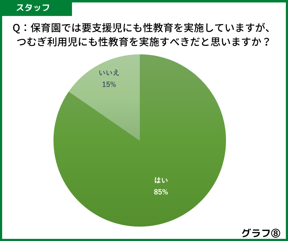 どろんこ会グループでは発達に気がかりのあるお子様を支援する子ども発達支援センター、児童発達支援事業所「つむぎ」も運営しています。発達支援に勤務する保育士に「保育園では要支援児にも性教育を実施していますが、同様に、つむぎ利用児にも性教育を実施すべきだと思いますか?」と質問したところ、84.6%が「実施すべき」との回答を得ました(グラフ⑧)。その理由として、