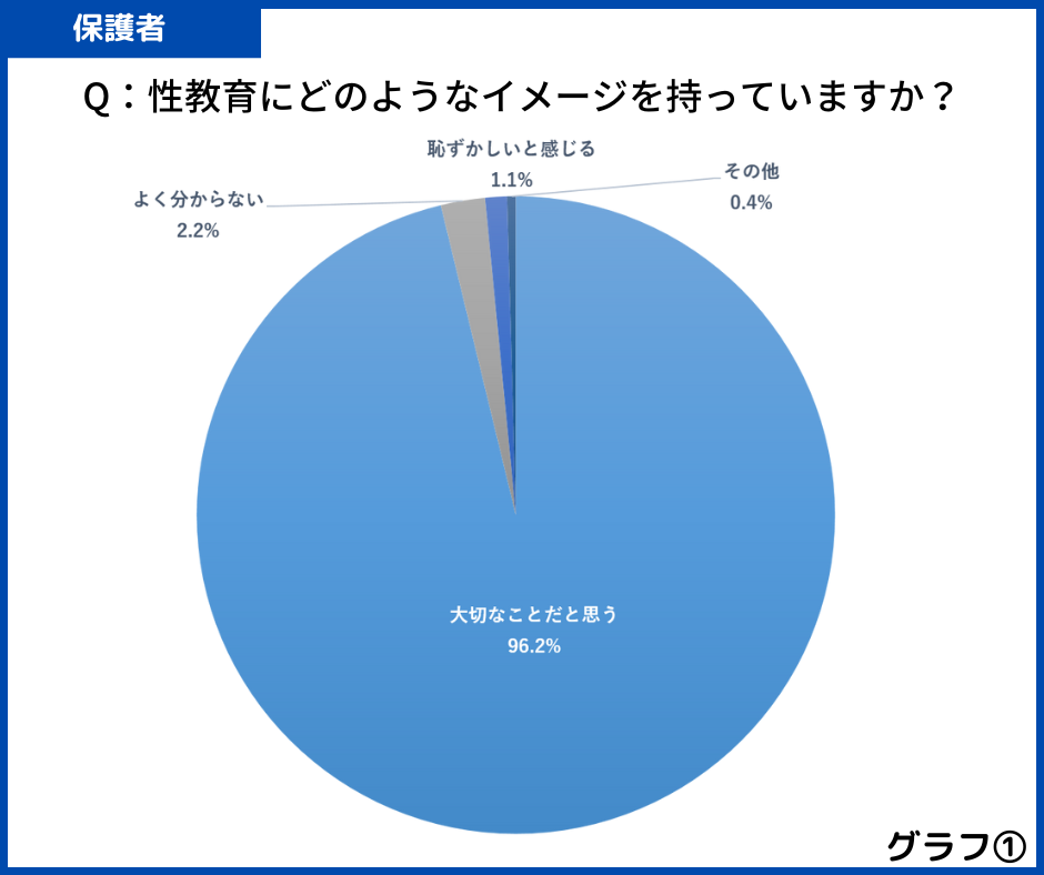 「性教育にどのようなイメージをもっていますか?」という質問に対し、グラフ①が示すとおり「大切なことだと思う」と回答した保護者は96.2%という結果になり、大多数の保護者が性教育を重視していることが分かりました。