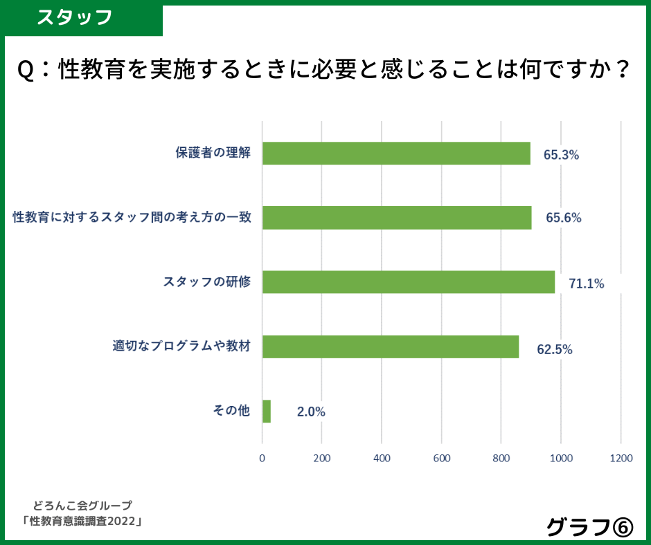 「保育園または発達支援の現場で性教育を実施するときに、必要と感じることは何ですか?」という質問に対しては、グラフ⑥のとおり「スタッフの研修」の重要性が浮き彫りとなりました。