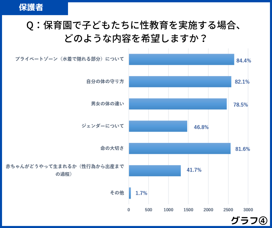 「保育園で子どもたちに性教育を実施する場合、どのような内容を希望しますか?(複数回答)」という質問に対しては、グラフ④が示すとおり、 「プライベートゾーンについて」「自分の体の守り方」に次いで、「命の大切さ」や「男女の体の違い」といったより本質的な内容も重視していることがうかがえます。