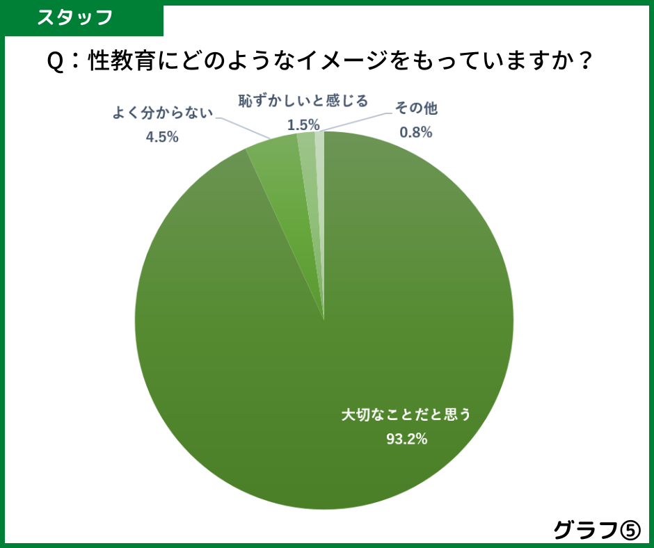 「性教育にどのようなイメージをもっていますか?」という質問に対し、「大切なことだと思う」と回答したスタッフはグラフ⑤のとおり93.2%という結果になり、保護者同様大多数のスタッフが性教育を重視していることが分かりました。