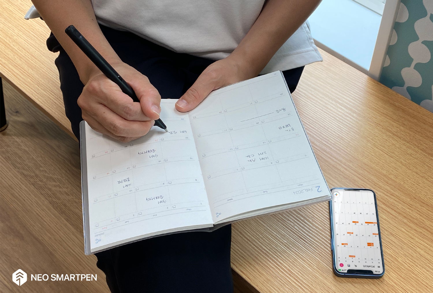 N plannerにNeo smartpenで手書きした予定は、専用アプリ「Neo Studio」によりノーステップで書いたそのままデジタル化されます。更に、Googleカレンダーなどに手書きがテキスト化しながら、時間の情報と共にスケジュールが連動されます。