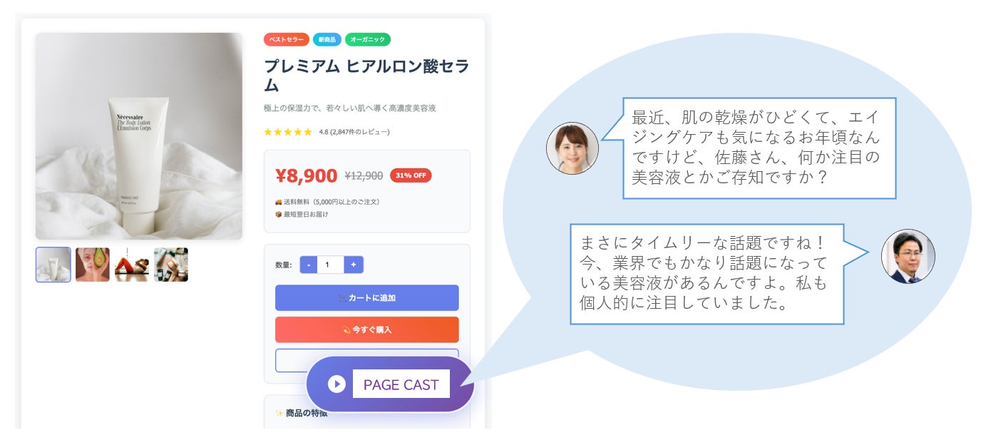 そこで今回、AI生成サービス「PAGE CAST」を導入することで、当社が得意としてきた“トークによる商品説明”を、より手軽に、そしてより多くのお客様にお届けできるようになります。さらに、生成されるトークの内容はディーブレスが監修し、今まで培ったノウハウを活かした分かりやすい説明を実現しています。