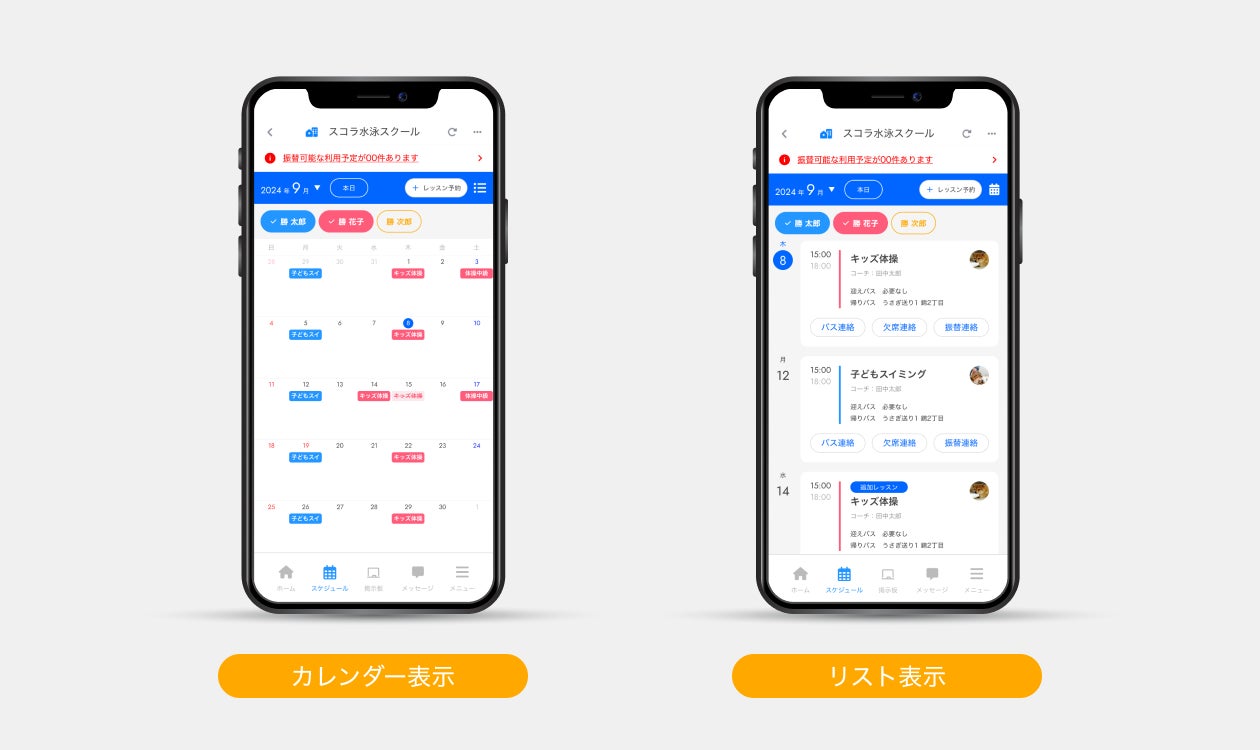 見やすさと使いやすさを融合した新デザインで、レッスンスケジュールはカレンダー表示とリスト表示を自由に切り替え可能。スクールのイメージに合わせたカラーテーマも追加され、操作性が大幅に向上します。