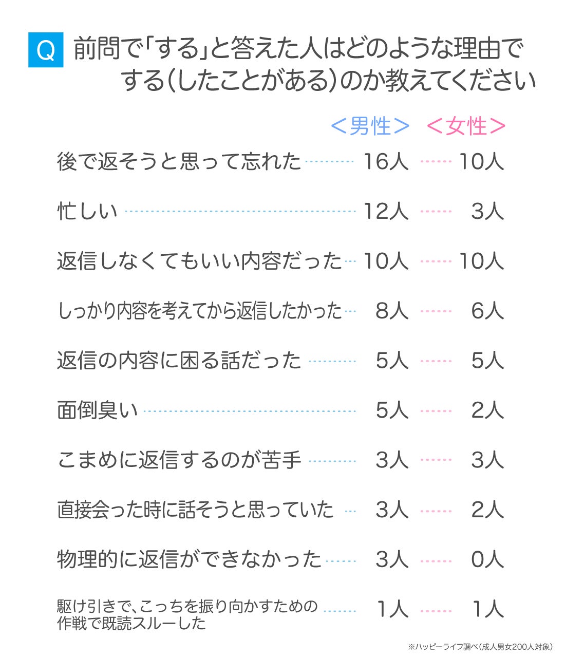 好きな人に既読スルーをするのは何故か?と聞いたところ、男女ともに「後で返そうと思って忘れた(男性16人、女性10人)」と回答した人が最多でした。