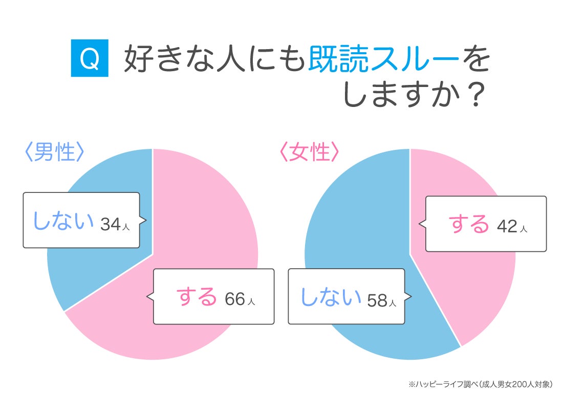 「好きな人にも既読スルーをしますか?」と聞いてみたところ、「する」と回答した男性は6割以上、女性は4割以上いました。