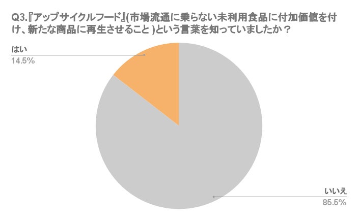 一方で、市場流通に乗らない未利用食品を新たに商品化する『アップサイクルフード』という言葉を知っている方は、全体の2割以下(14.5%)にとどまりました。