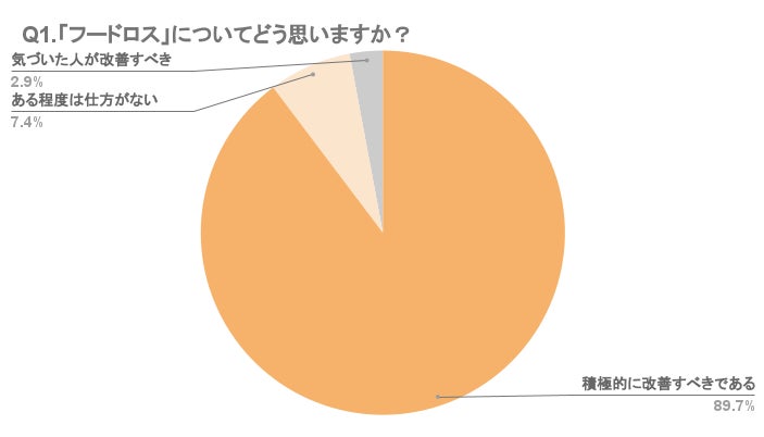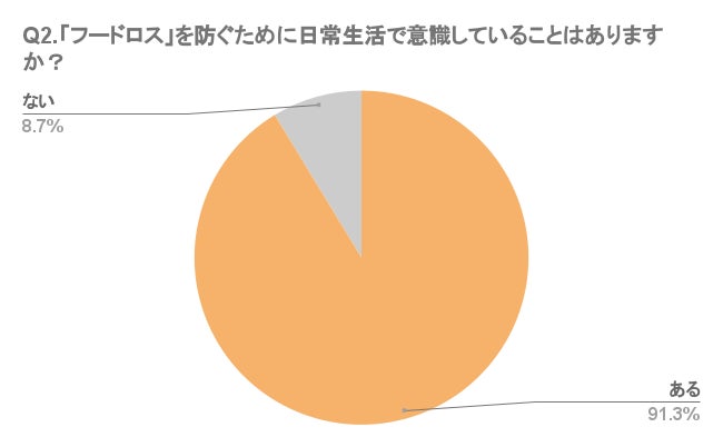 展示会で当ブースを訪れた来場者約70名によると、フードロスについてどう思うか?という問いに対して、9割近くの方が「積極的に改善すべきである」(89.7%)と回答しました。また、フードロスを防ぐために日常生活で意識していることがある、と答えた方も9割以上(91.3%)に上りました。