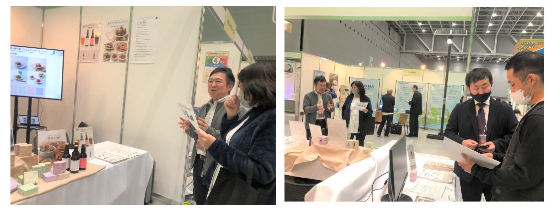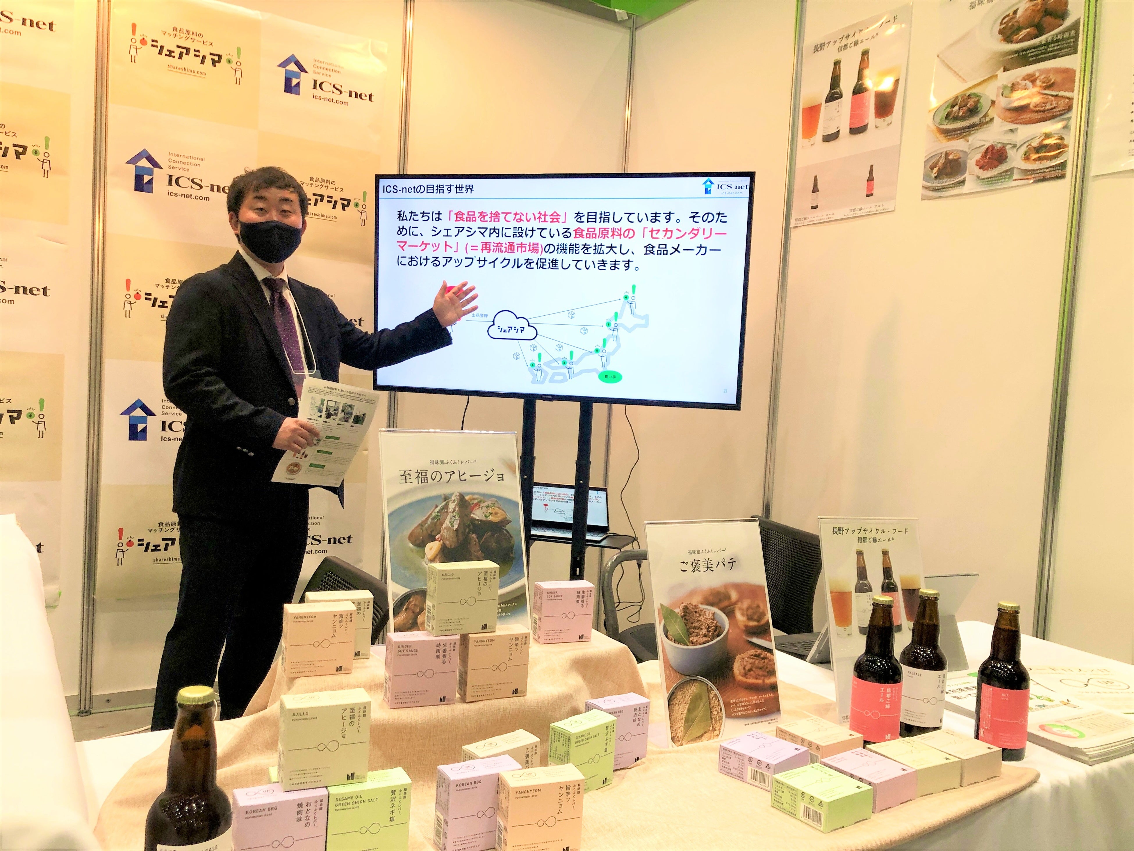 当社のブースでは、余剰になっている未利用食品原料に付加価値をつけて新しい食品を生み出す「長野アップサイクル・フード」の取り組みや、食品業界のDX化を推進するWebプラットフォーム「シェアシマ」についてご紹介しました。