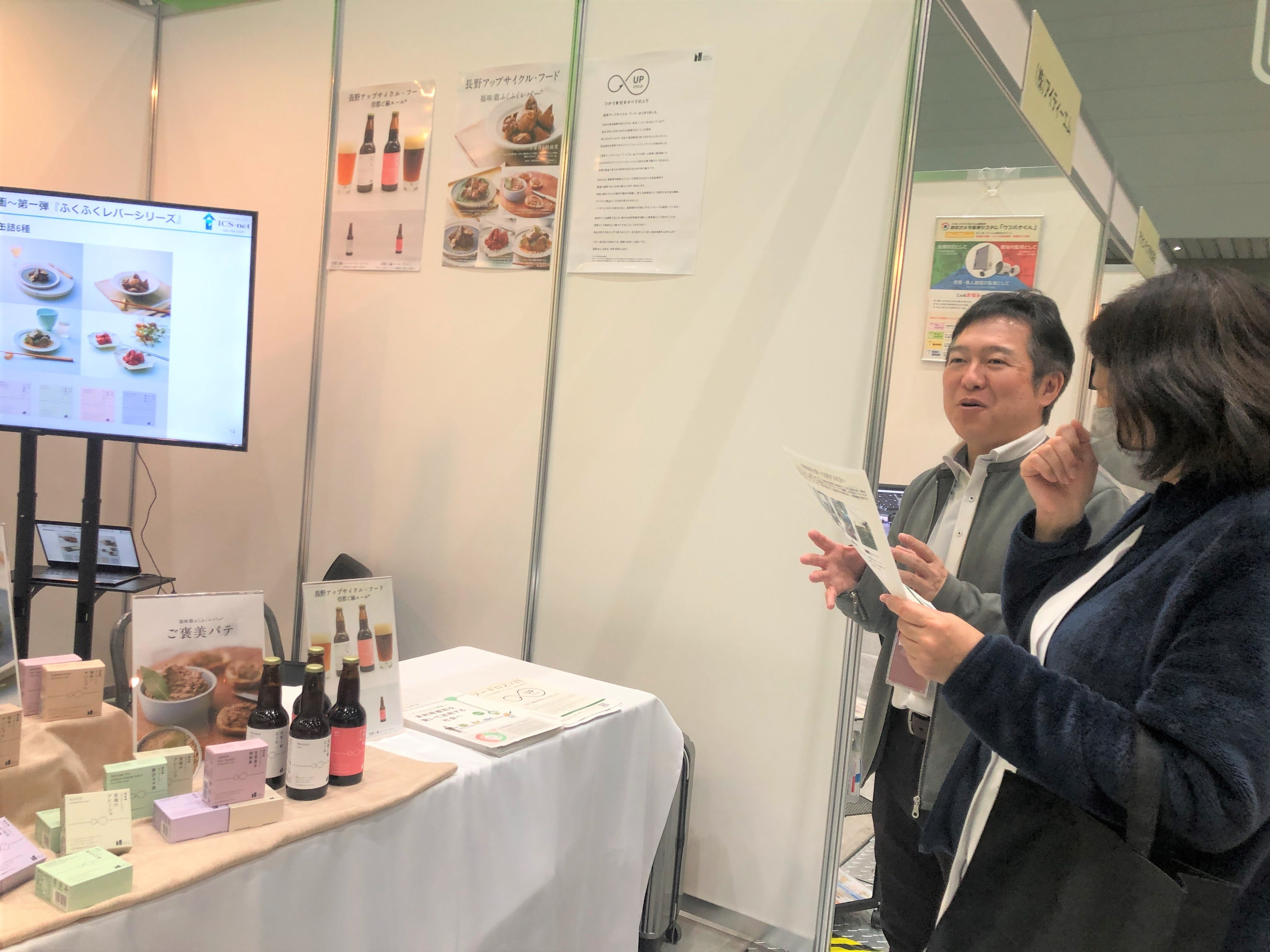 当社はこれまで、市場流通に乗らない信州福味鶏のレバー及びハツを使用したグルメ商品、信州の観光みやげ品であるウエハースの端材を使用したクラフトビールの企画・開発等に携わっています。展示会ブースではこれらの取り組みをご紹介しました。