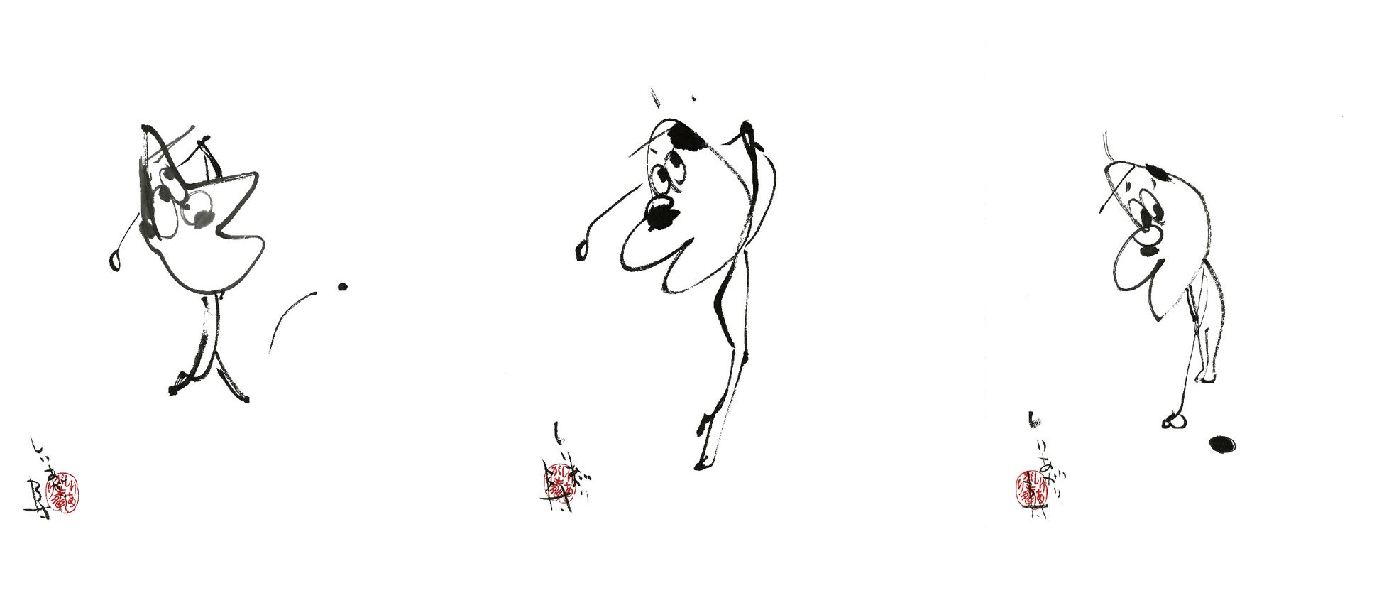 江戸時代の浮世絵師・北斎の作品を現代的ユーモアで描き直すパロディ作品や墨絵などで近年活動の幅を広げているしりあがり寿。今回の展示のテーマは「北斎とゴルフ!」。日本を代表するゴルフ運営会社の太平洋クラブとコラボで制作した『冨嶽三十六景孔球版』や、しりあがり寿のこれまでのパロディ作品『ちょっと可笑しなほぼ冨嶽三十六景』を展示。また今回は新作も発表!オヤジがゴルフにはまってしまった姿を墨絵で描き、9作品が展示されます。