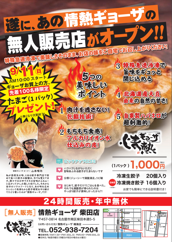 冷凍餃子の無人販売所は近年続々と増えていますが、冷凍焼き餃子の販売は今回が日本初(※)。美味しい焼き方にこだわる「情熱ギョーザ」ならではの、餃子の無人販売の新展開です。今後は、より多くのお客様に「情熱ギョーザ」の美味しさを体験いただけるよう、店舗拡大を計画中。「情熱ギョーザ」の冷凍餃子無人販売店を、どうぞご期待ください。