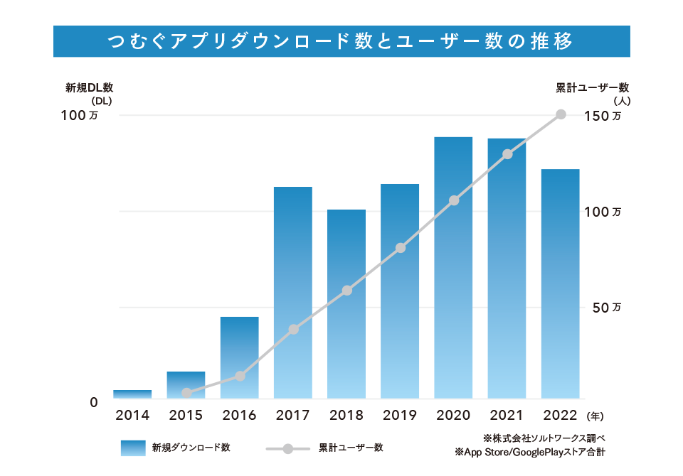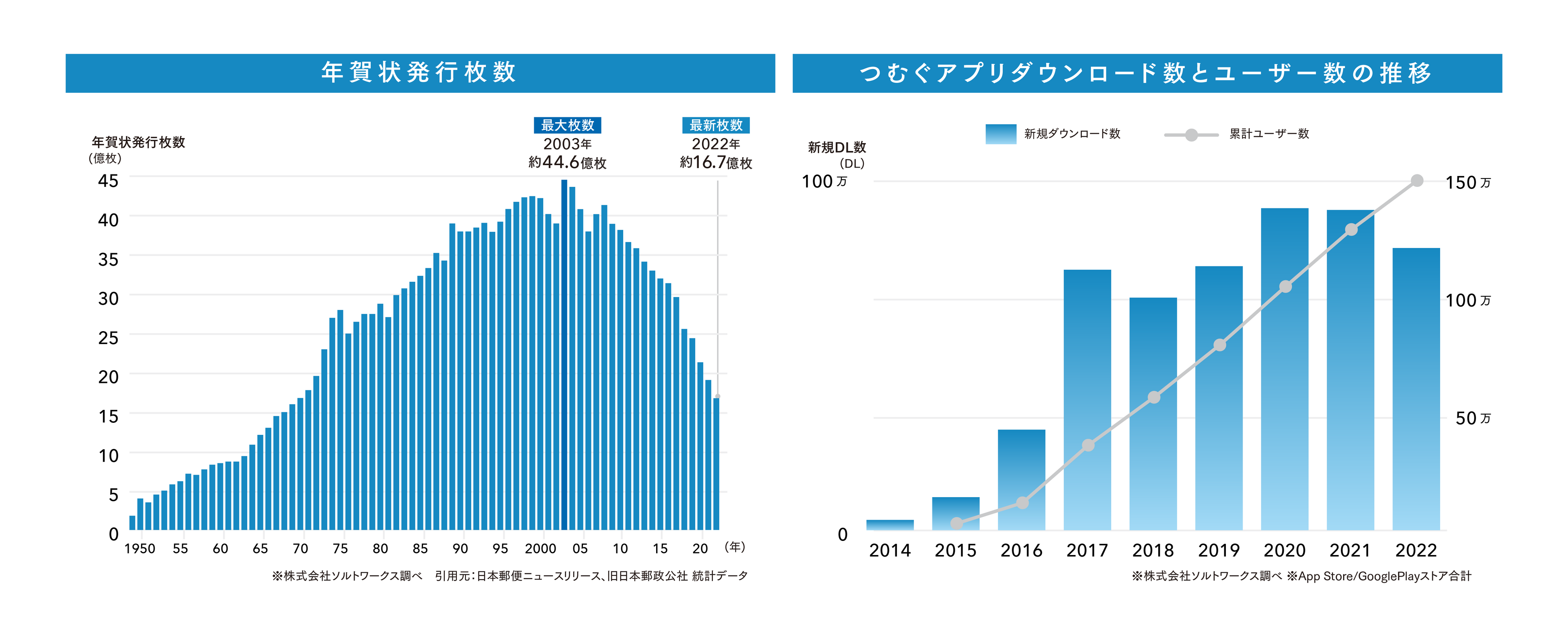 一方でスマートフォンを使って手軽に作成できる年賀状作成アプリのニーズが年々高まっていて、APPストアでは現在約40種類の年賀状作成アプリがリリースされています(当社調べ)。2015年にリリースした「つむぐ年賀」は在宅時間が増えたコロナ禍で特に注目が高まり、2020年以降ダウンロード数・ユーザー数が例年以上に伸びました。ユーザーの5割以上が20代〜30代の女性であることからも、長年儀礼として年賀状を送ってきた人々が退職や終活の一環として年賀状じまいをする一方で、子育て世代や若者は写真を添えたオリジナル年賀状を、新たなコミュニケーションツールや年に一度のイベントとして前向きに捉えているといえます。