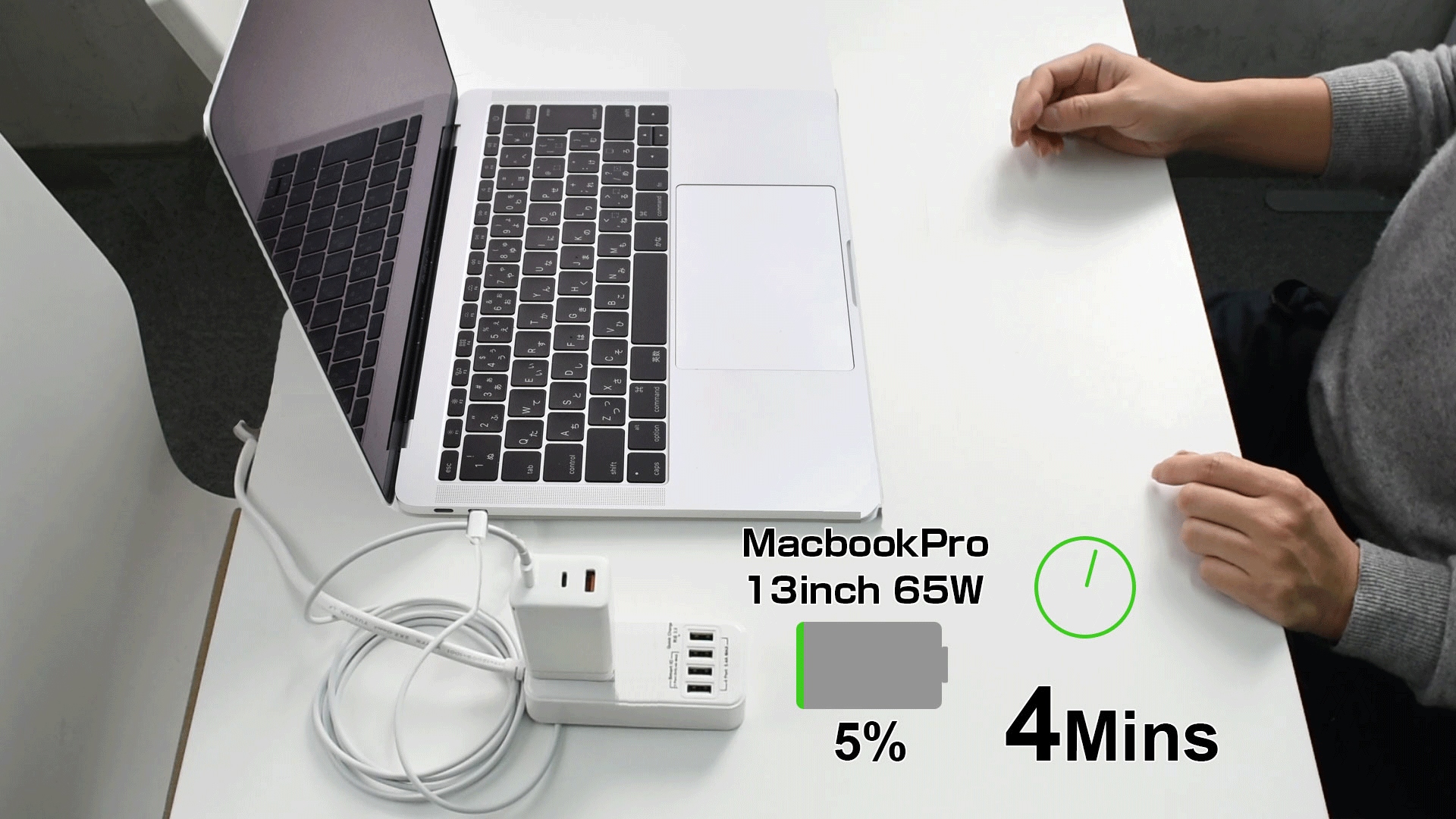 2つのUSB-CポートはスマートフォンとMacbookが同時充電できる45W+18W仕様。急速充電対応スマートフォンでは充電時間が大幅に短縮可能です。