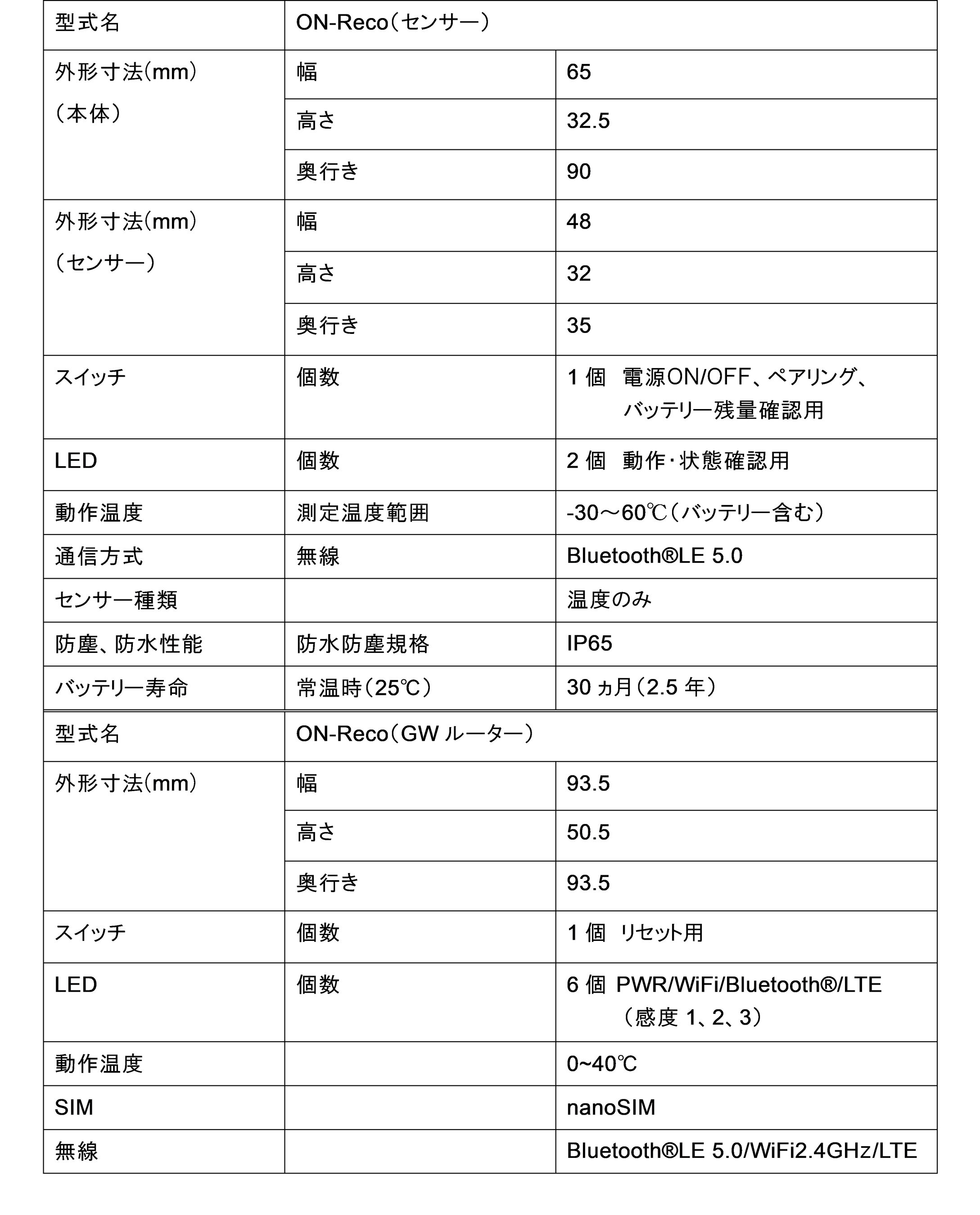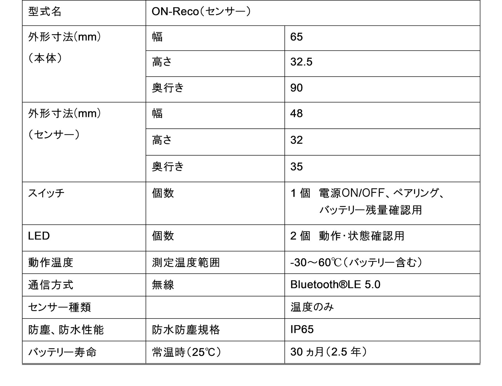 「ON-Reco」は、温度センサーを20台まで増設することが可能で、複数の冷凍・冷蔵庫、ショーケースの温度データを一覧表示することができます。バッテリーを内蔵した無線温度センサーは小型で軽量のため、設置が容易であるだけでなく敷設工事が不要なことから省コスト化も実現、コンビニエンスストアやスーパーマーケット、ドラッグストアをはじめ、様々な施設での温度管理に活用が可能です。