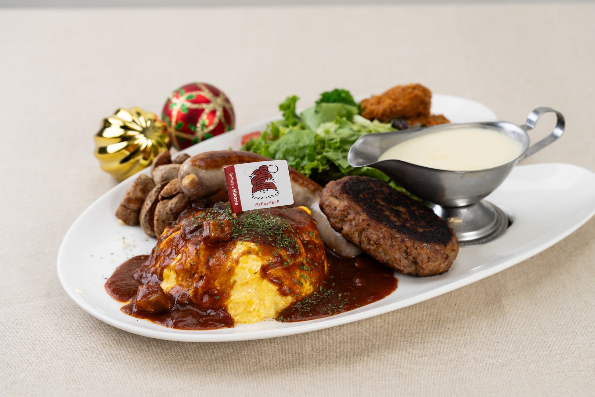 クリスマス限定、大人向けにアレンジしたお子様プレート。デミグラスソースをかけた、とろとろオムライスはボリューム満点です。ハンバーグとソーセージは、お好みで温かいチーズをかけてお召し上がりいただけます。