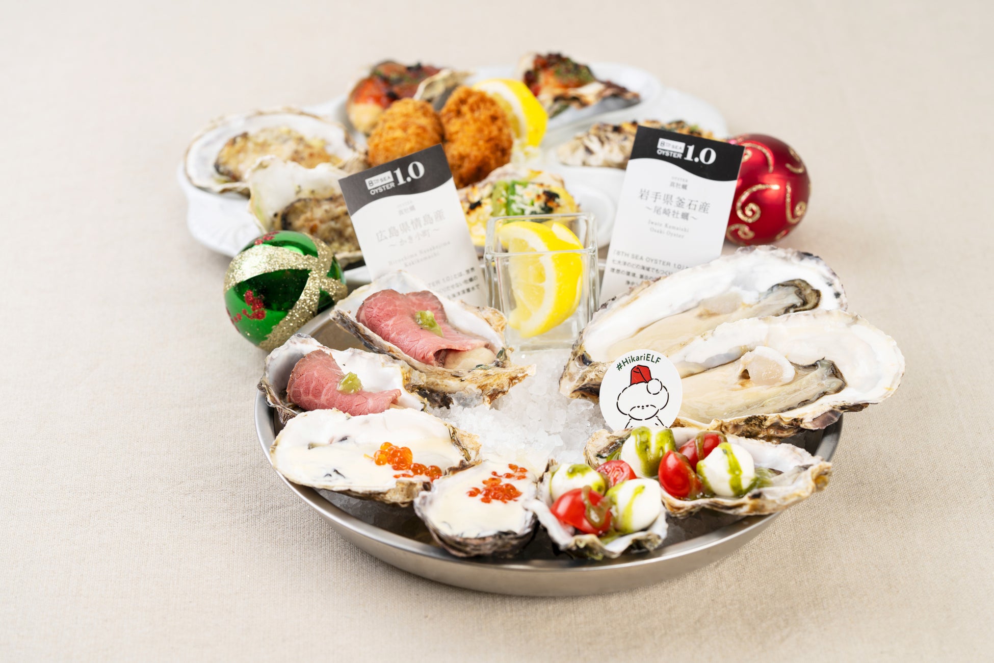 様々な調理法の牡蠣を16個楽しめる、お得なセット。生牡蠣や焼き牡蠣をローストビーフやイクラなどで贅沢にトッピングしています。安全で美味しい牡蠣がテーブルをクリスマスカラーに彩る期間限定メニューです。