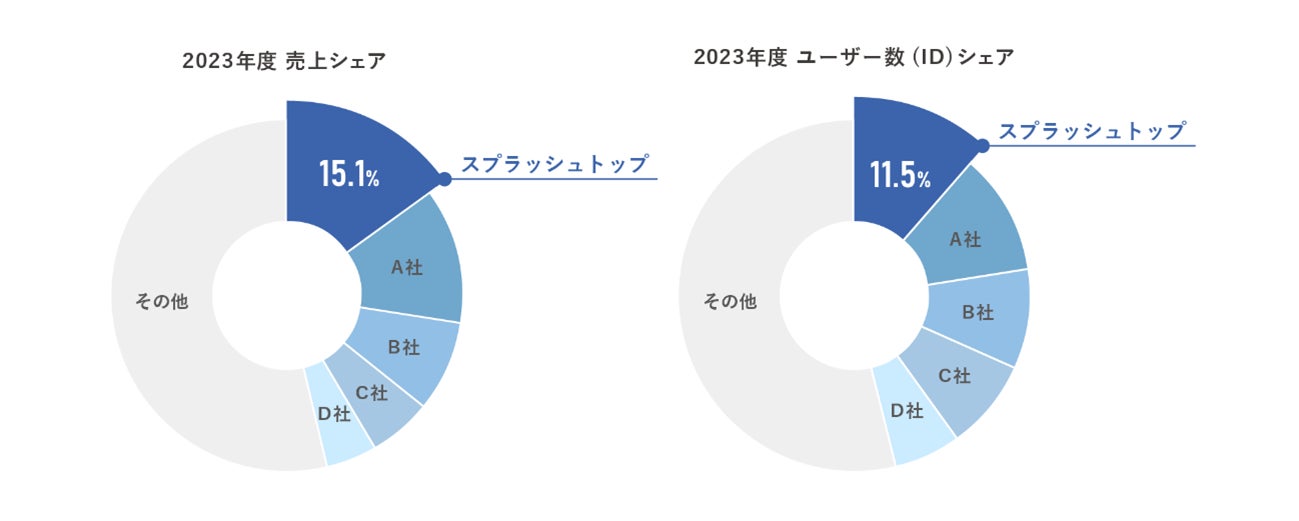 同レポートのリモートアクセスサービスのマーケットシェアのうち、2023年度のスプラッシュトップの売上シェアは15.1%で1位となり、2024年度も引き続き1位が見込まれています。またユーザー数(ID)のシェアでも2023年度では11.5%で1位となっています。
