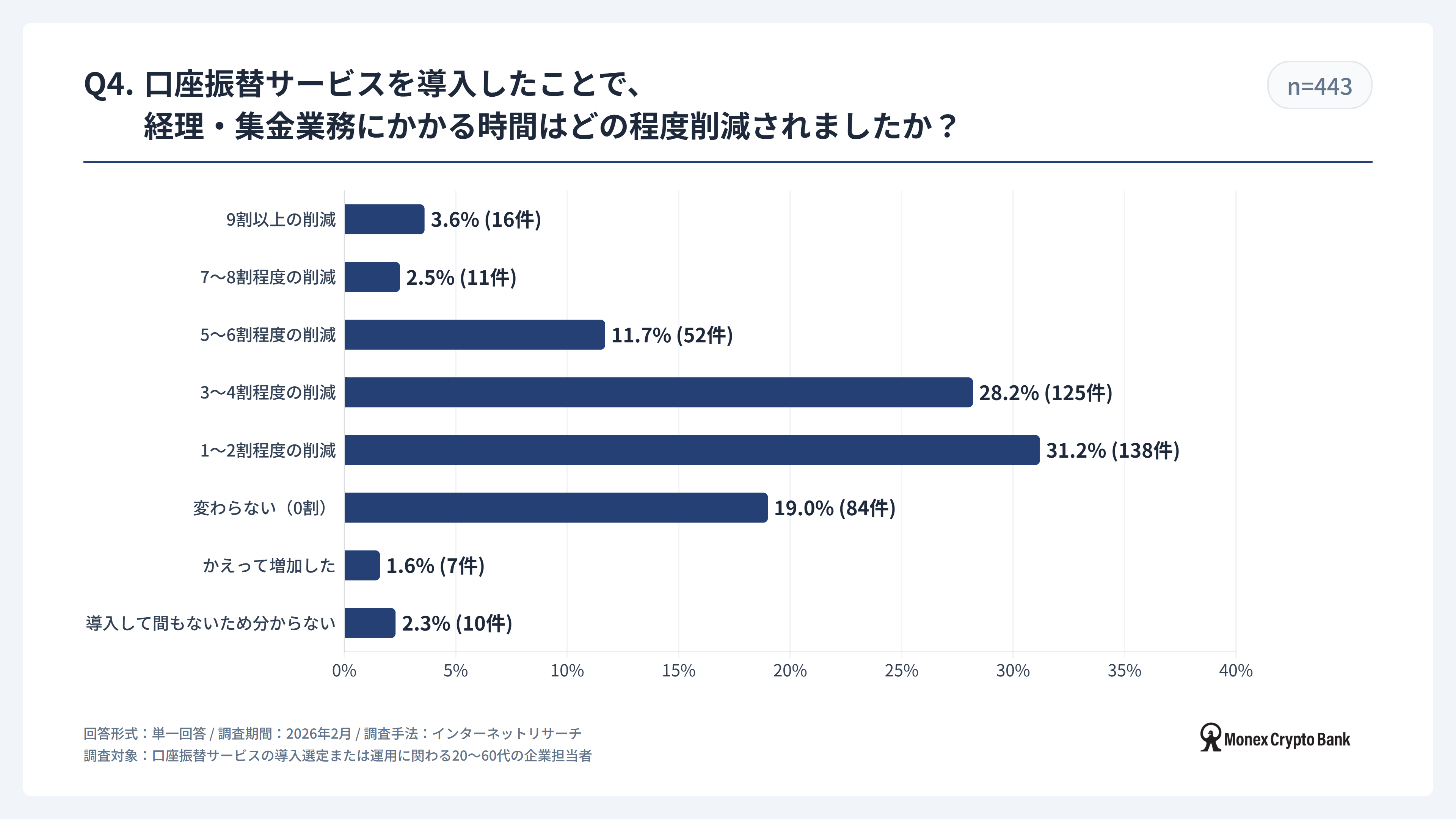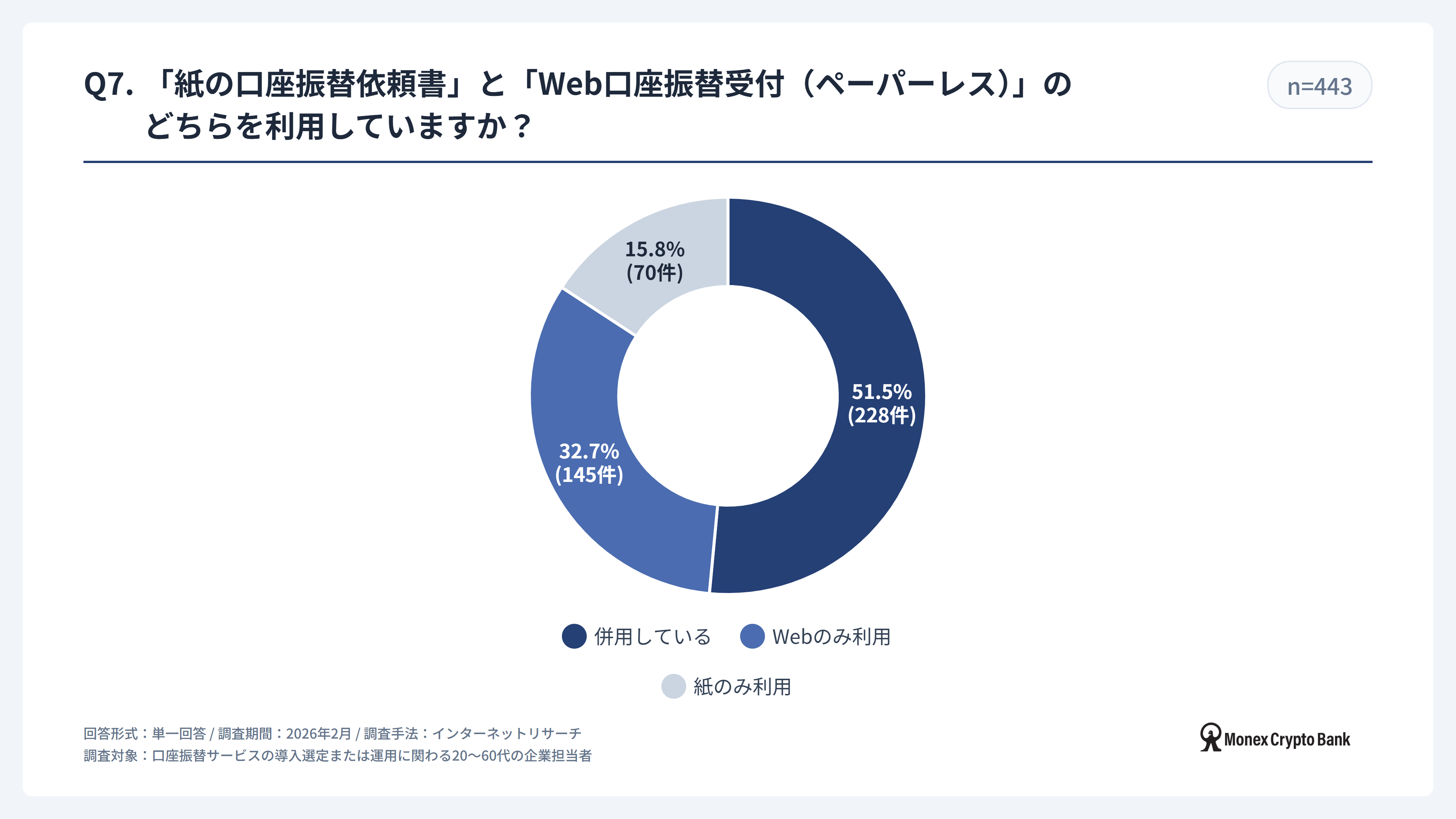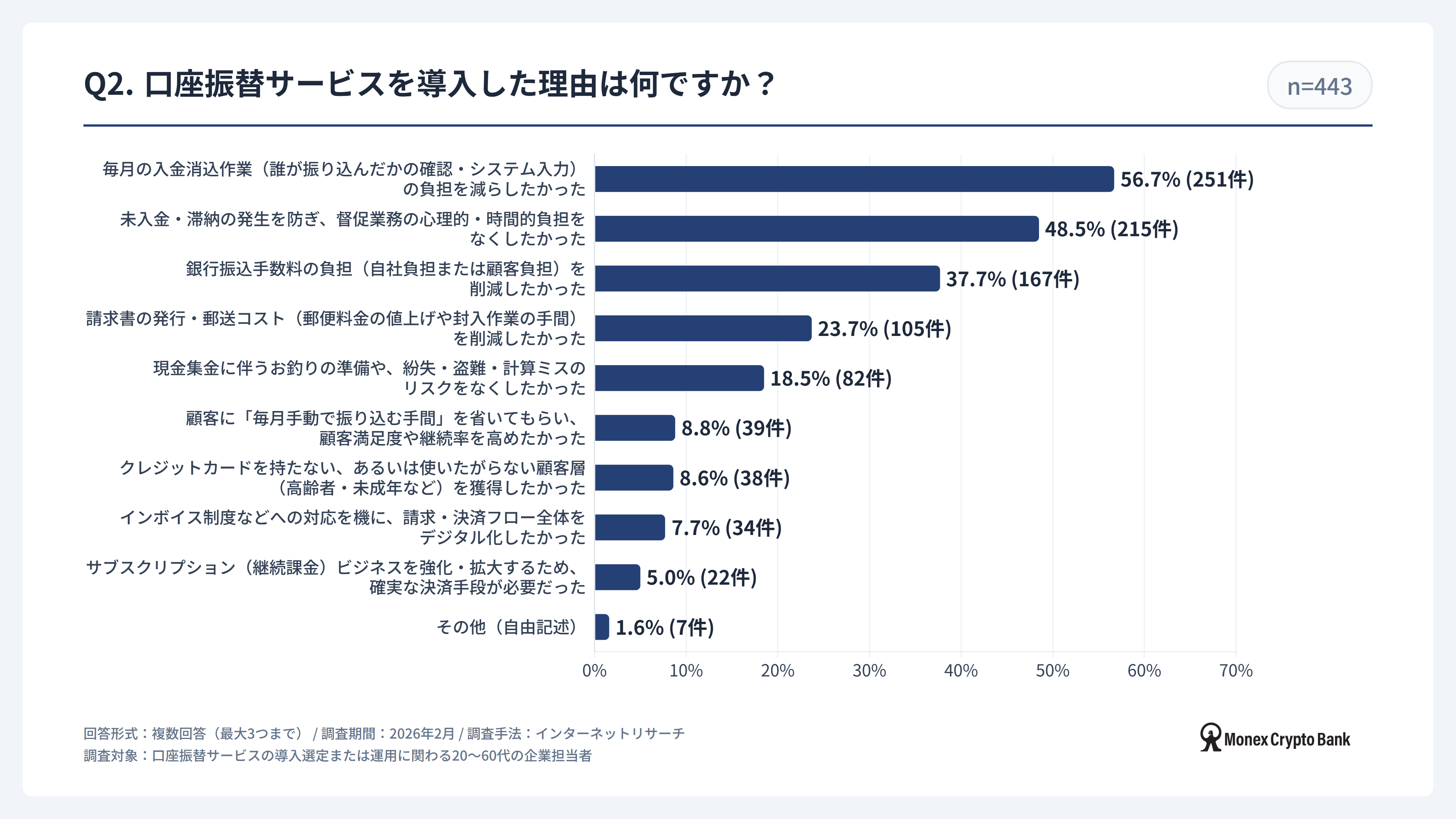 マネックスクリプトバンク株式会社(本社:東京都港区、代表取締役社長:万代惇史、以下「マネックスクリプトバンク」)は、口座振替サービスの導入選定または運用に関わる20~60代の企業担当者443名を対象に、2026年2月に「口座振替サービス利用実態調査」を実施いたしました。 本調査では、口座振替サービスの市場シェア、導入の背景、および運用における課題など、企業の口座振替サービスに関する利用実態を調査しています。