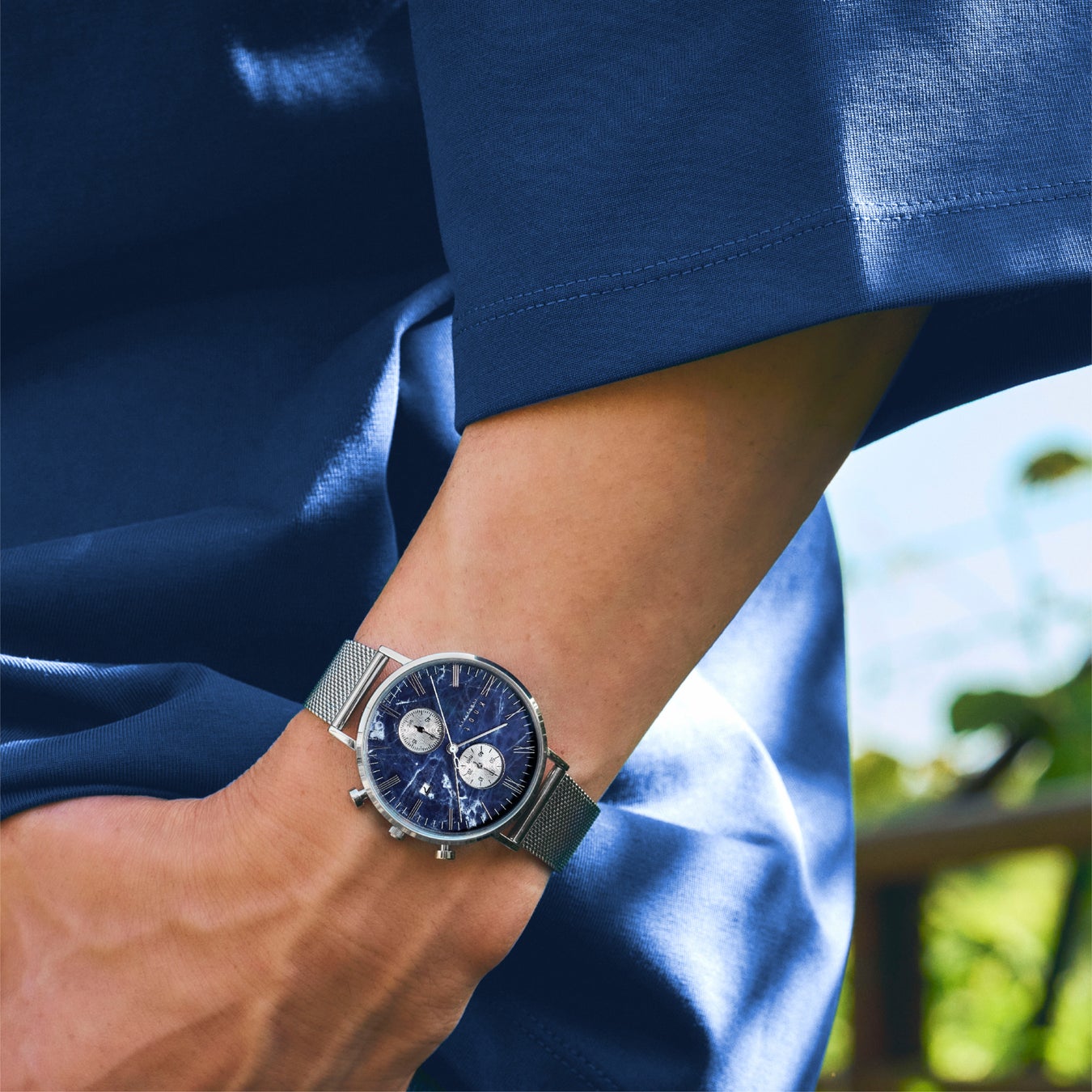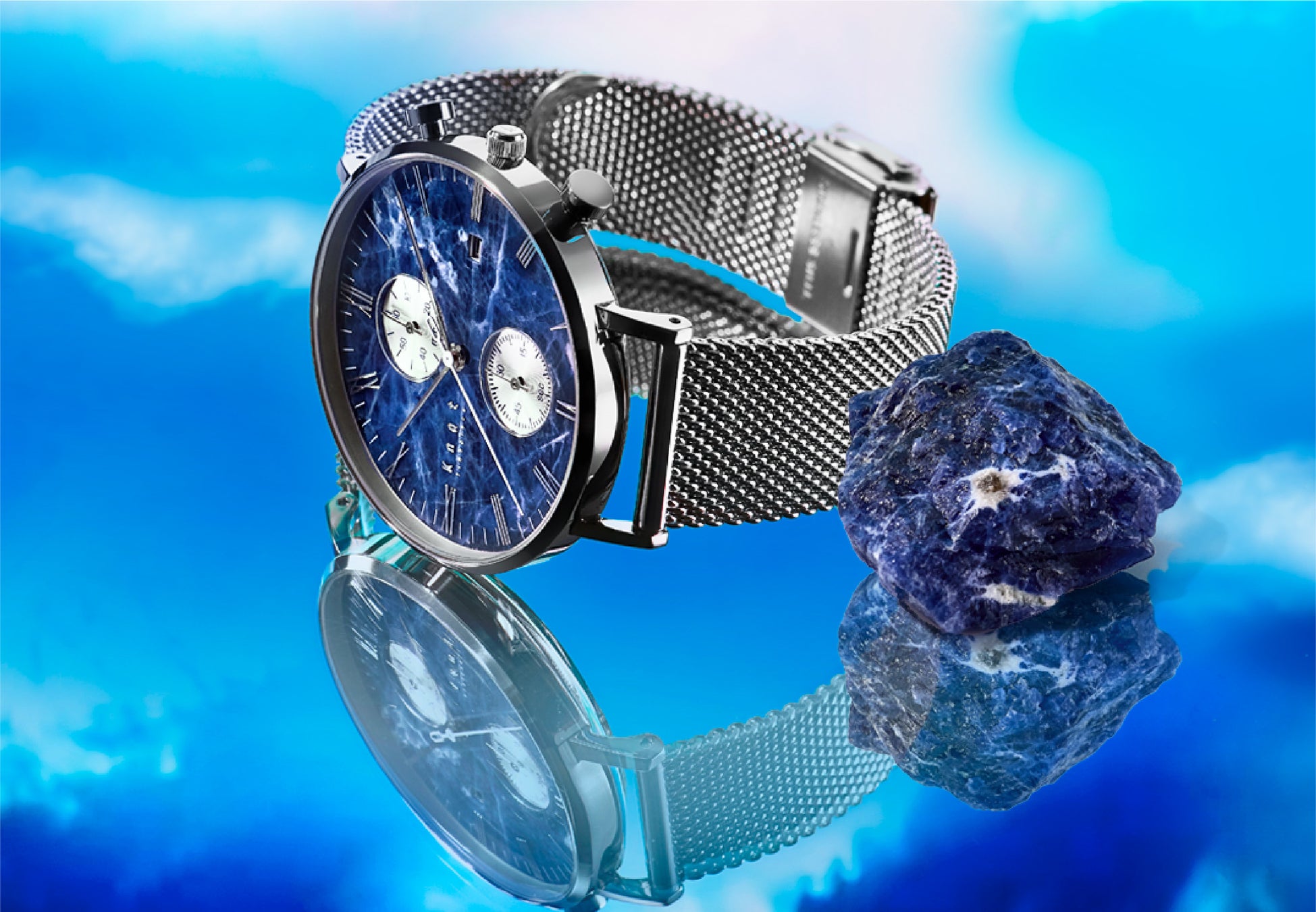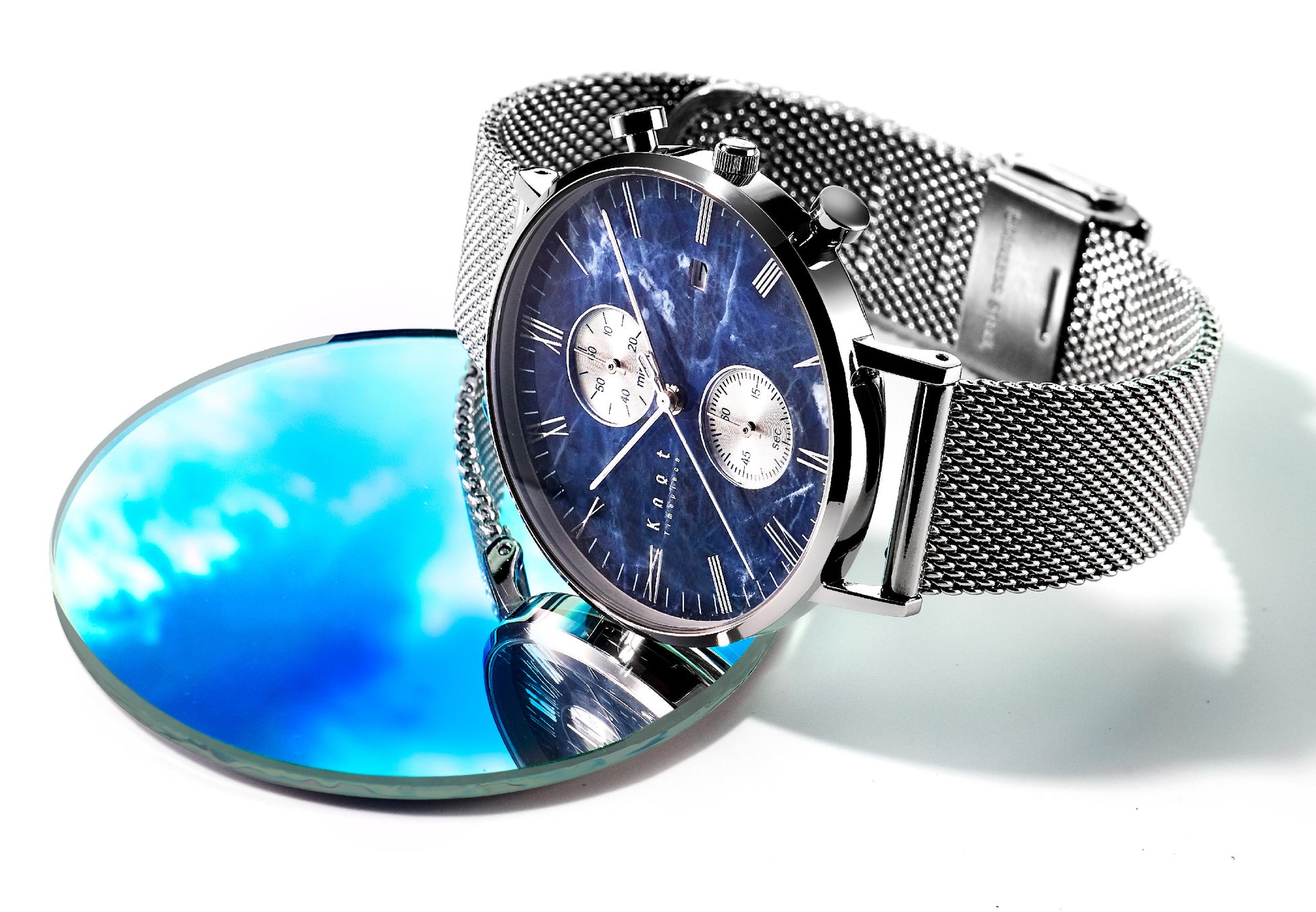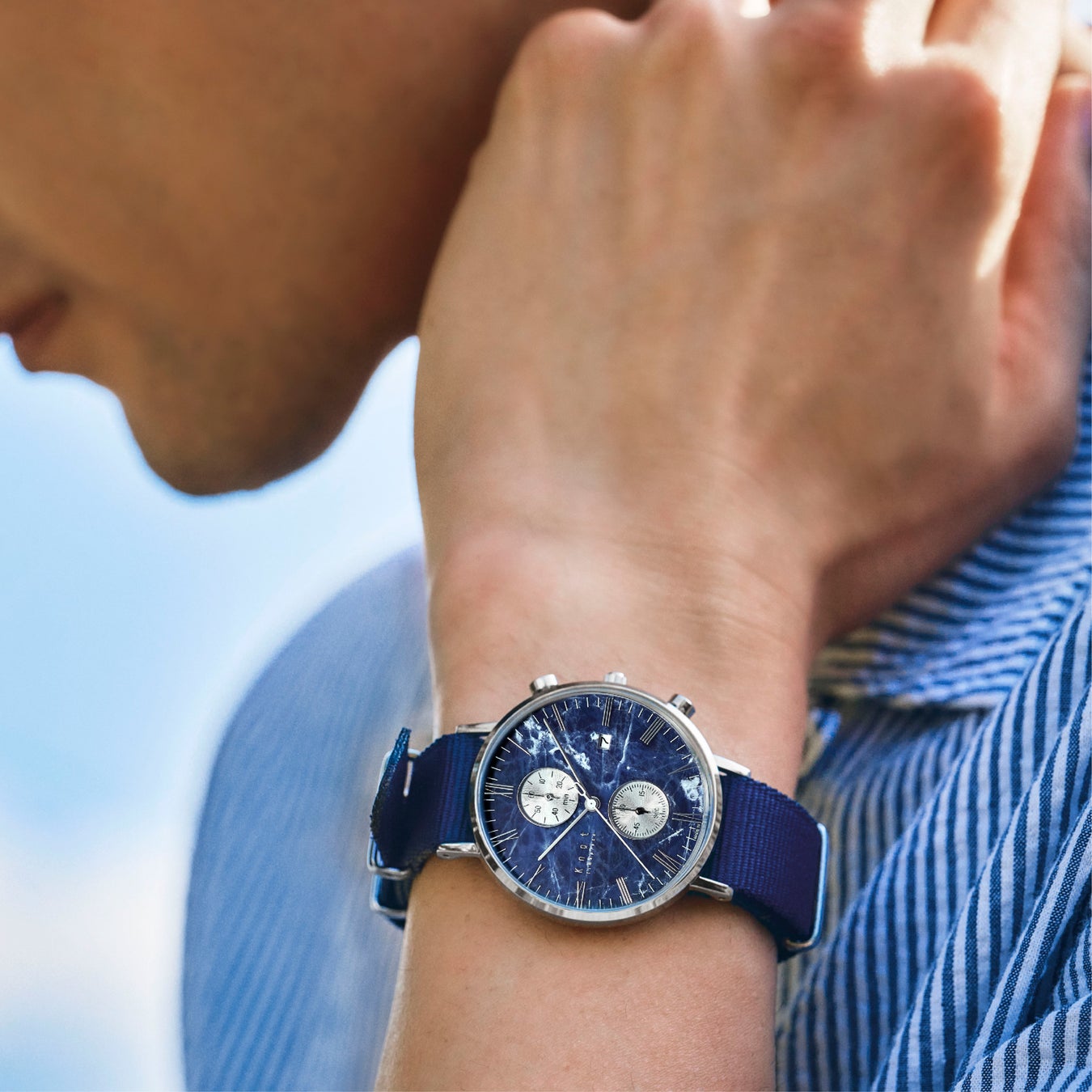 クラシカルなローマンインデックスには立体的な加工を施し、石の模様と重なっても読みやすいのもポイントです。Knotで人気のクラシックシリーズからストップウォッチ機能付きのクロノグラフ(https://knot-designs.com/c/collection/watch/chronograph)をベースにした限定コレクションです。