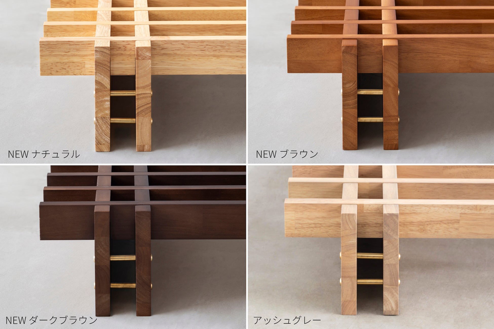 素材はラバーウッドの集成材を使用。木目はとても柔らかく穏やかで、なめらかな手触りが特徴です。サイズはシングル、セミダブル、ダブル、クイーンをラインナップ。組み立ての部品には真鍮を使用し、温かみのある木材を引き締め、プロダクト全体に高級感をもたらしています。