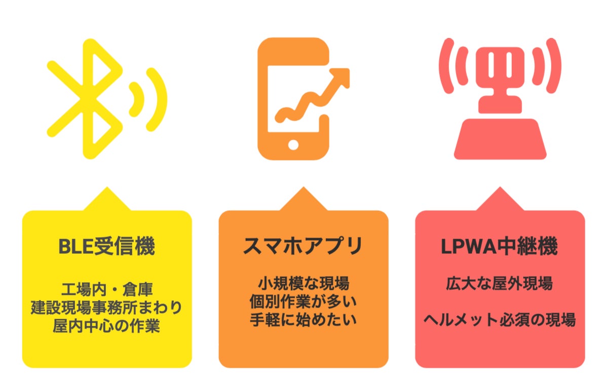 ~既存の「BLE受信機経由方式」に加え、「スマホアプリ経由方式」とヘルメット装着型「LPWA中継機経由方式」が新登場~