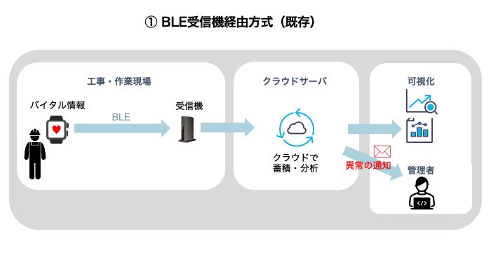 専用のBLE(Bluetooth Low Energy)受信機を設置し、特定エリア内で活動する複数作業員のバイタルデータを集約してクラウドへ送信する方式です。