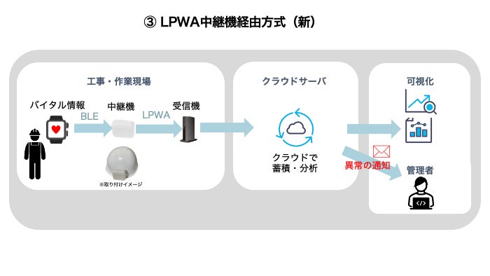 LPWA技術を活用した小型中継器(ヘルメット装着型LPWA中継器)を作業員のヘルメットに装着。バイタルデータを中継機を経由してクラウドへ送信する方式です。