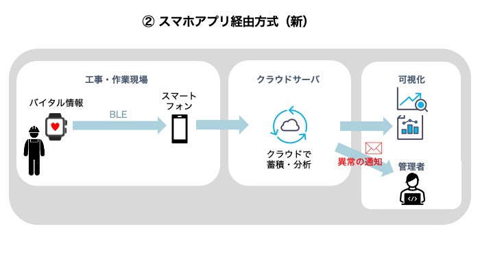 作業員のバイタルデータを、お手持ちまたは貸与されたスマートフォンにインストールした専用アプリを経由してクラウドへ送信する方式です。