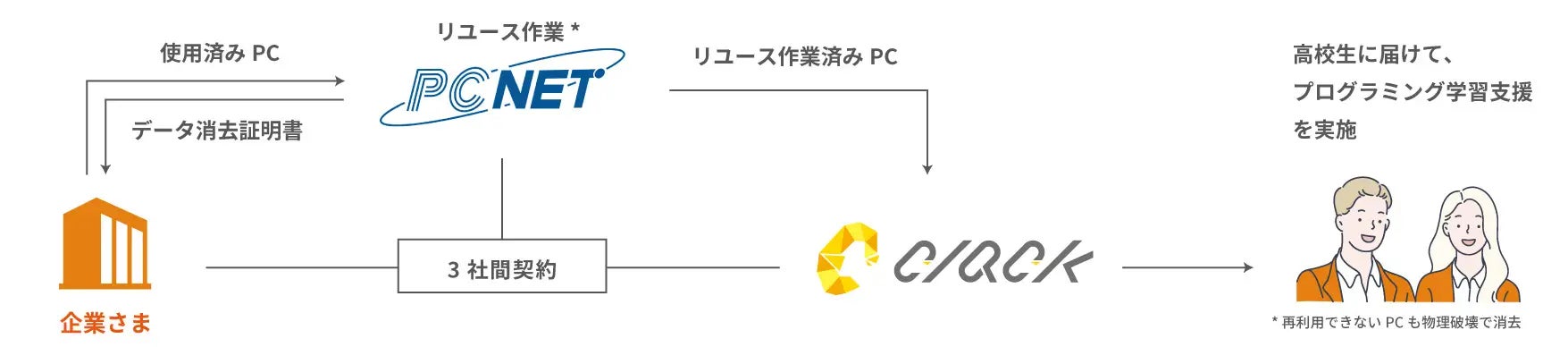 CLACKは、困難を抱える高校生に対し、企業から譲り受けたリユースPCを完全無料のプログラミング教育とともに届けることで”自走力”の向上を支援する「Pass the Baton(パス・ザ・バトン)」を2021年6月より実施しています。ご寄贈いただく使用済みのPCは、パートナー企業である東証スタンダード上場の株式会社パシフィックネットにて、情報漏洩を防ぐデータ消去を実施し、クリーニングやOSの再インストールをおこなったうえで高校生のもとに届けられます。